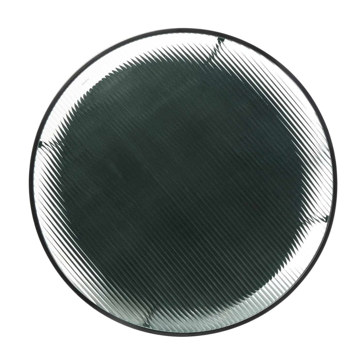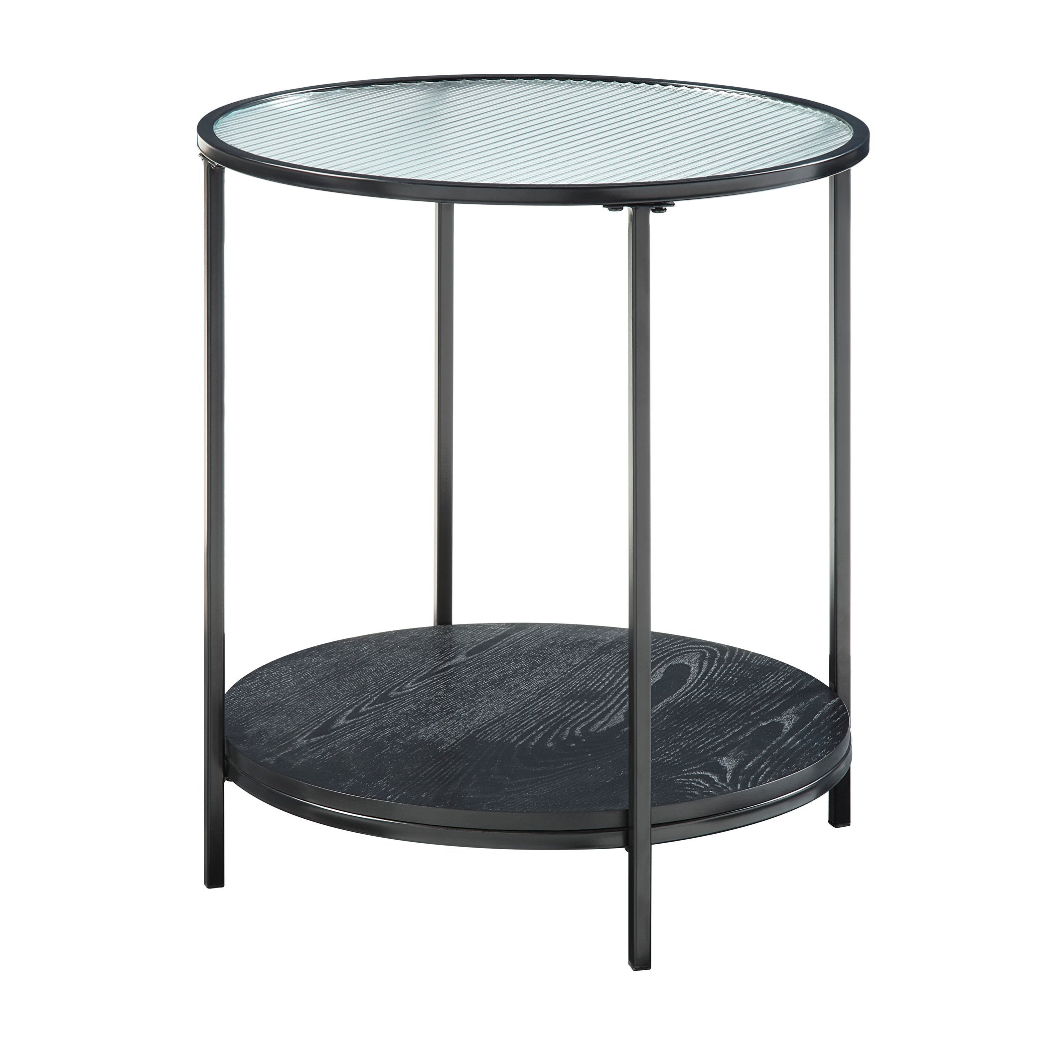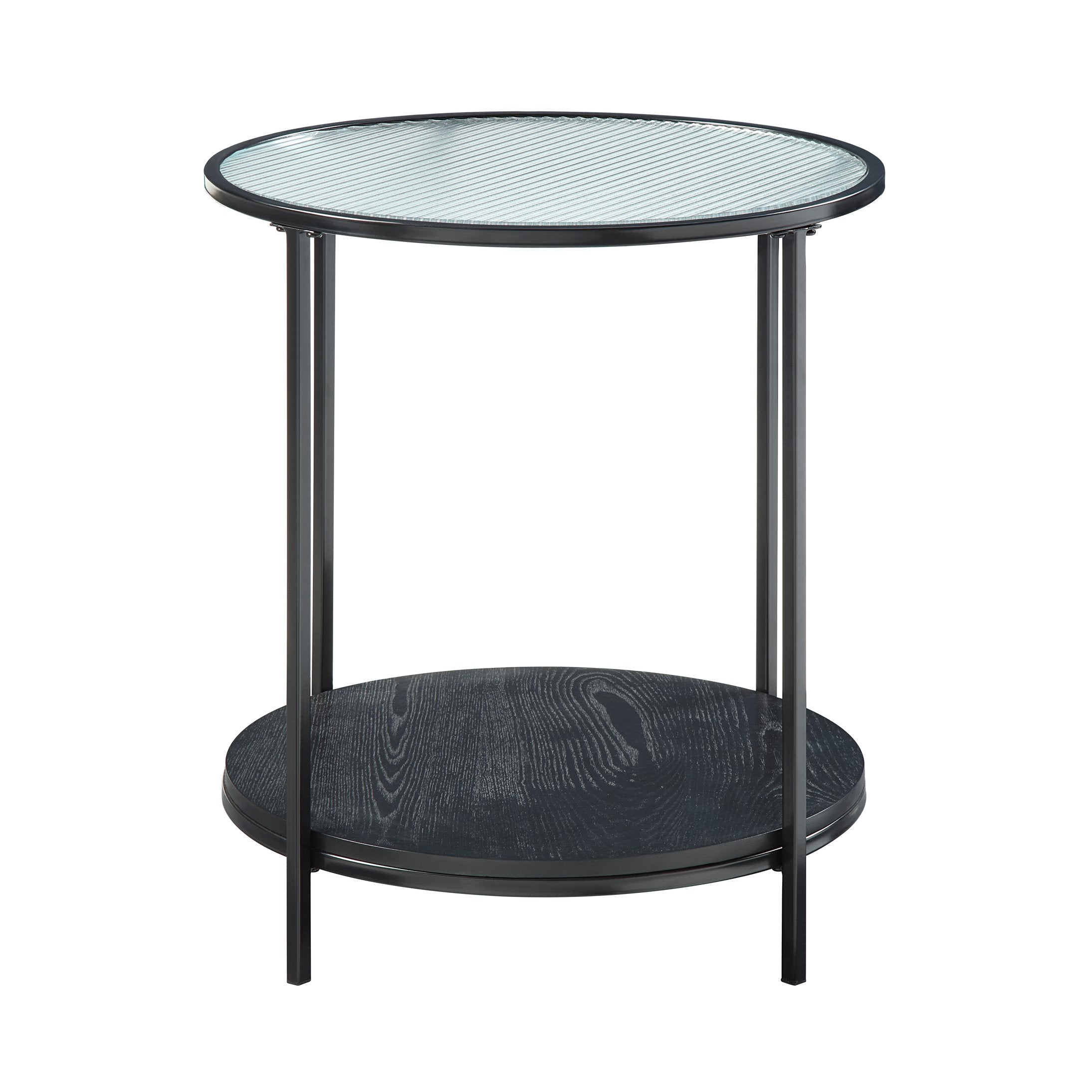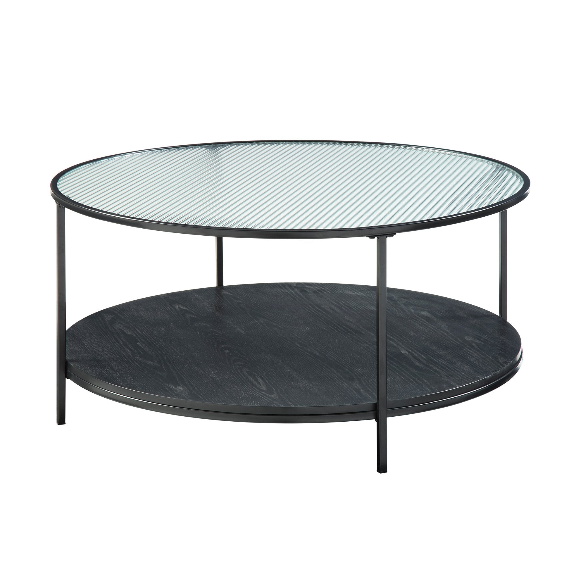 - Design: Round fluted glass top with a linear metal frame for contrasting modern silhouettes; black-finished metal legs and black-finished wood lower shelf for added storage and display.
