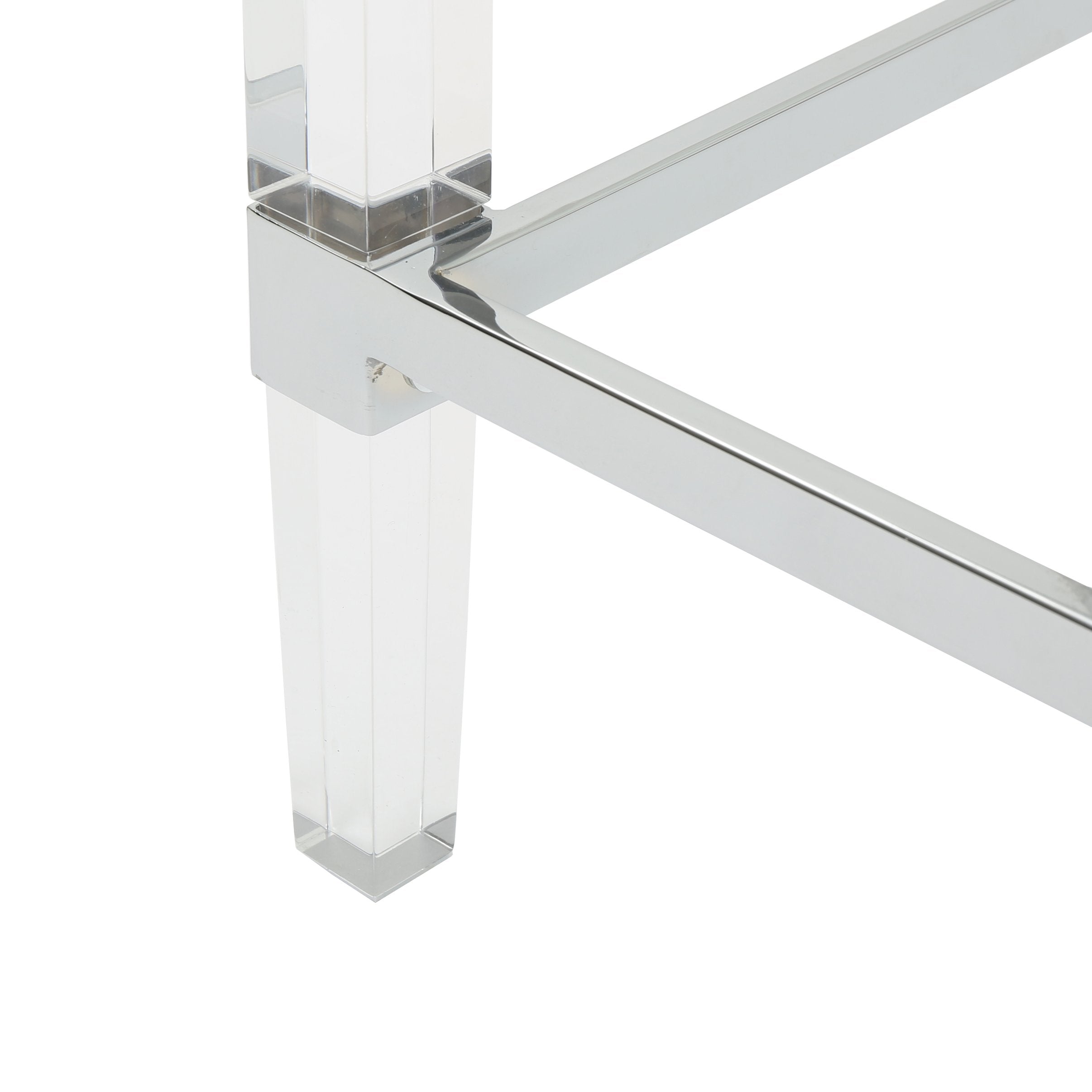 - This ultra-modern tempered glass and acrylic table coffee table offers a broad, nearly invisible surface upon which to float all your beautiful things. A bold statement, it’s made from the highest-quality materials. It will become a welcome member of the family.