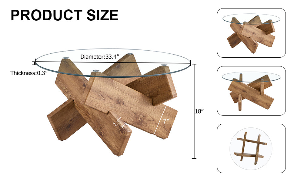 Bring a touch of modern farmhouse charm to your living space with this circular glass coffee table. Its clear tempered glass top and warm wood-colored MDF legs create an airy, minimalist look that complements contemporary, Scandinavian, and rustic interiors. Designed for everyday use, it balances style with durability and easy assembly.