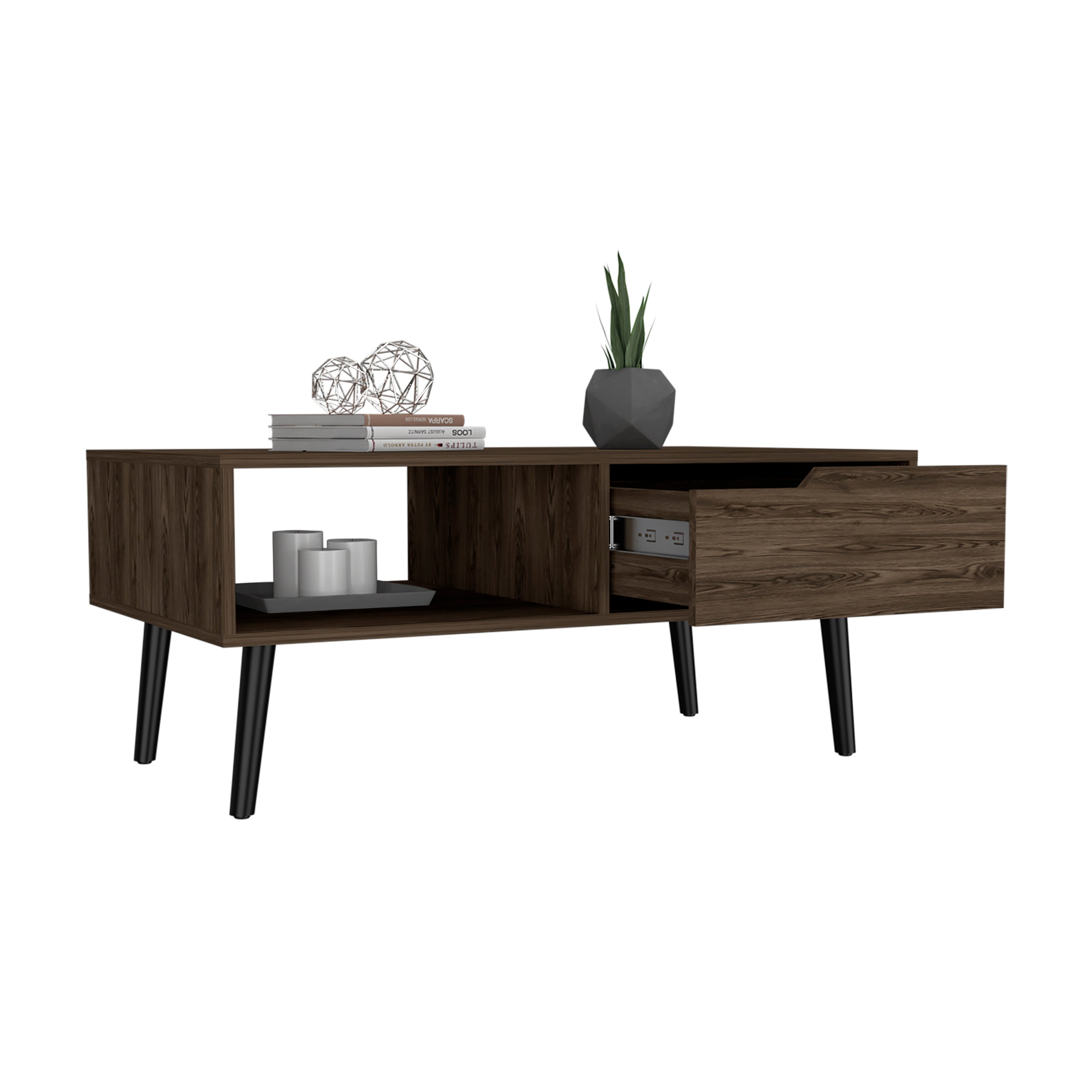Enhance your living room with a sleek, space-saving coffee table that blends modern simplicity with practical storage. Finished in rich dark walnut, this compact table offers an open shelf and a drawer to keep remotes, magazines, and small items organized while maintaining a tidy, stylish surface for drinks and decor.