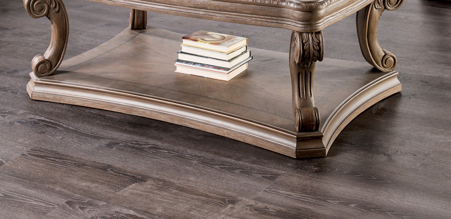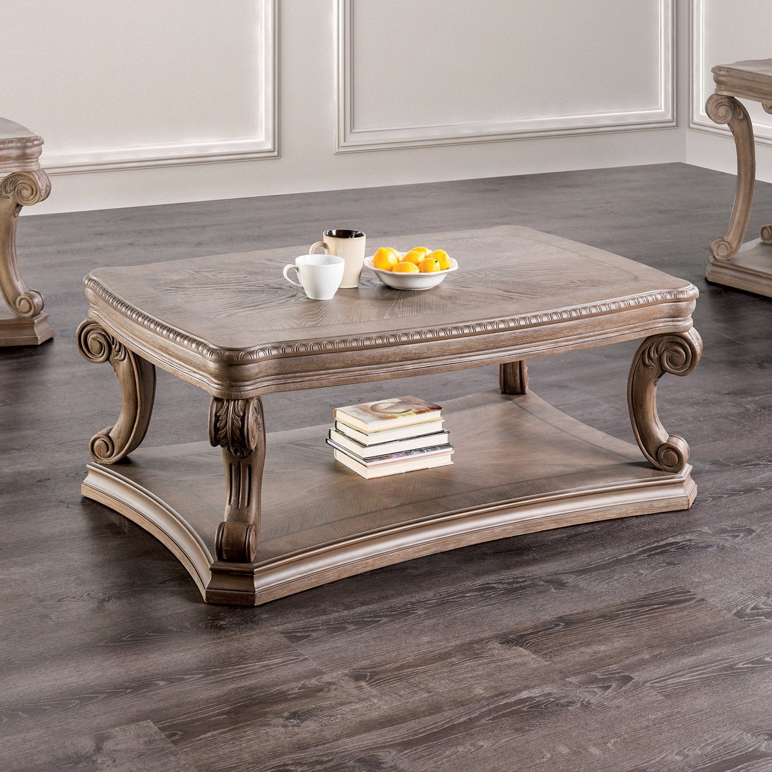Bring classic elegance to your living room with this traditional coffee table, finished in weathered oak and detailed with dentil moldings and carved scroll legs. Its spacious tabletop and open lower shelf provide practical display and storage space while the sturdy construction ensures everyday durability. Ideal for classic and transitional interiors, this piece balances ornate craftsmanship with functional design.