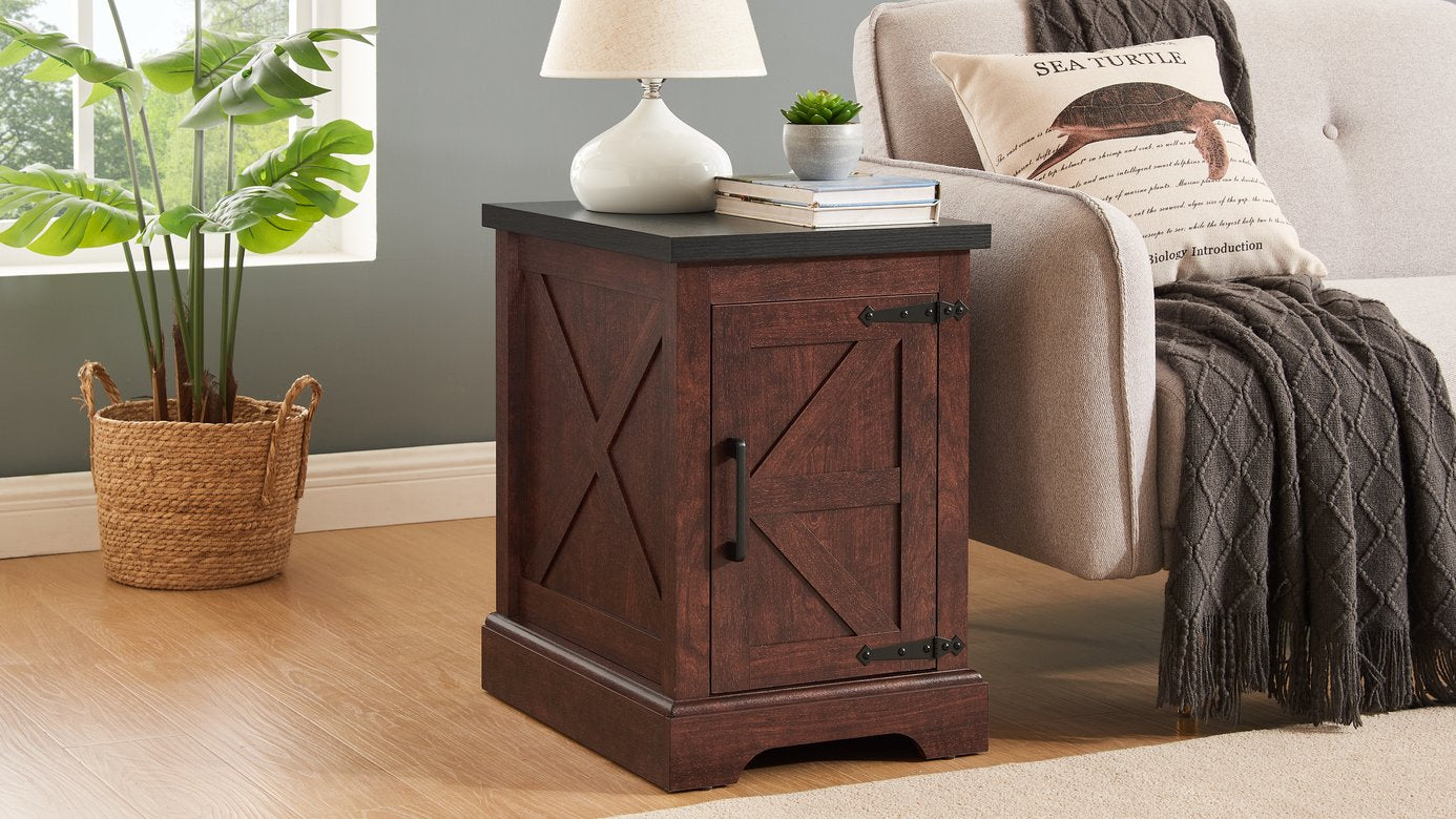 - The Farmhouse End Table exudes timeless elegance with its classic design inspired by farm barn doors, complemented by sleek black metal accents that add a touch of retro flair. This exquisite piece seamlessly blends modern rustic charm with vintage farm style, creating a captivating fusion of old and new. The unique wood grain surface beautifully captures the essence of natural wood, infusing your home with an inviting and organic atmosphere. Not only does this end table offer practical function