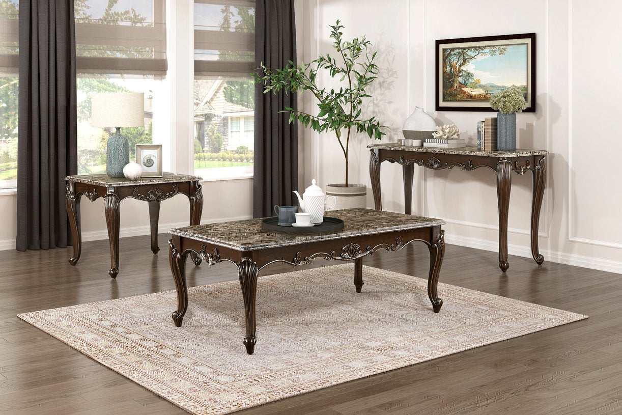 Elevate your living room with this refined cocktail table from the Balthasar Collection — a harmonious blend of traditional craftsmanship and luxe materials. A genuine marble top rests on gracefully carved cabriole legs, while a cherry finish with gold tipping highlights the ornate apron scrollwork for a stately, timeless centerpiece.