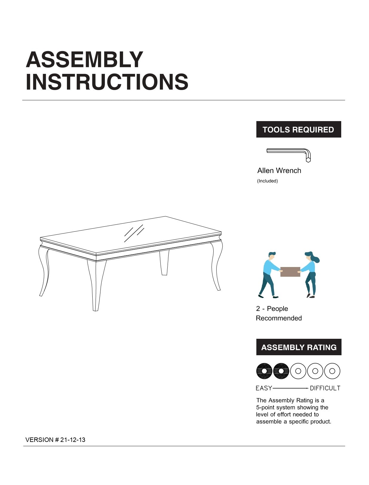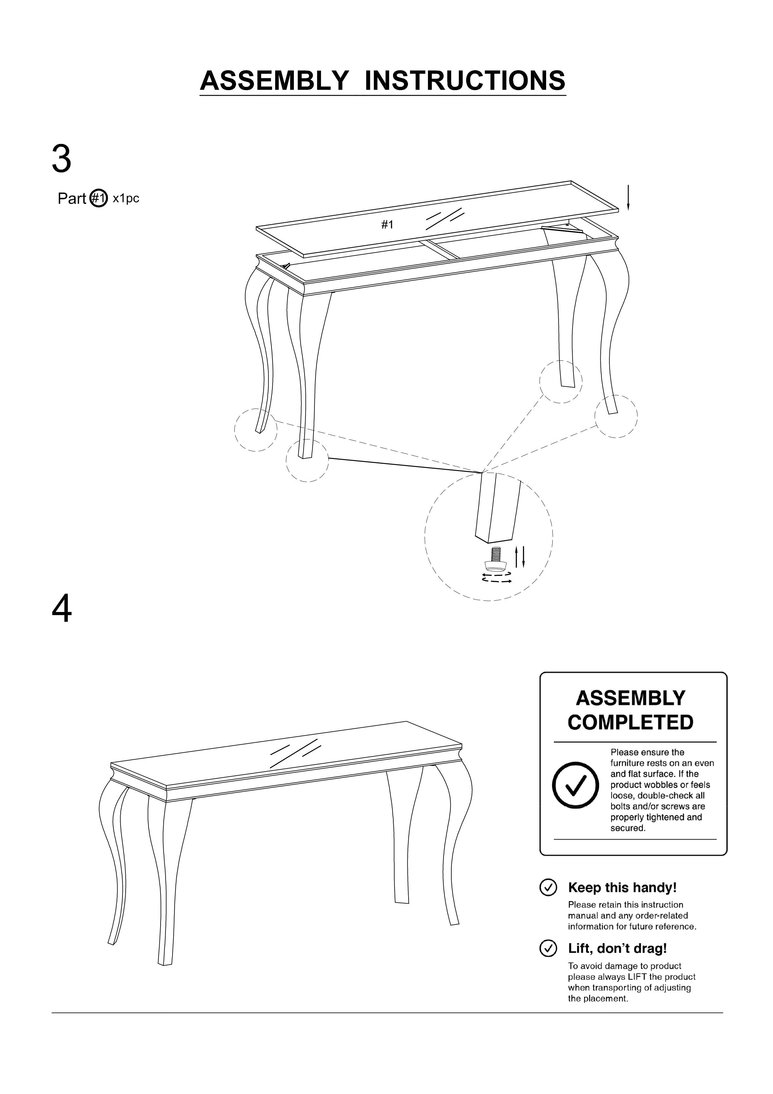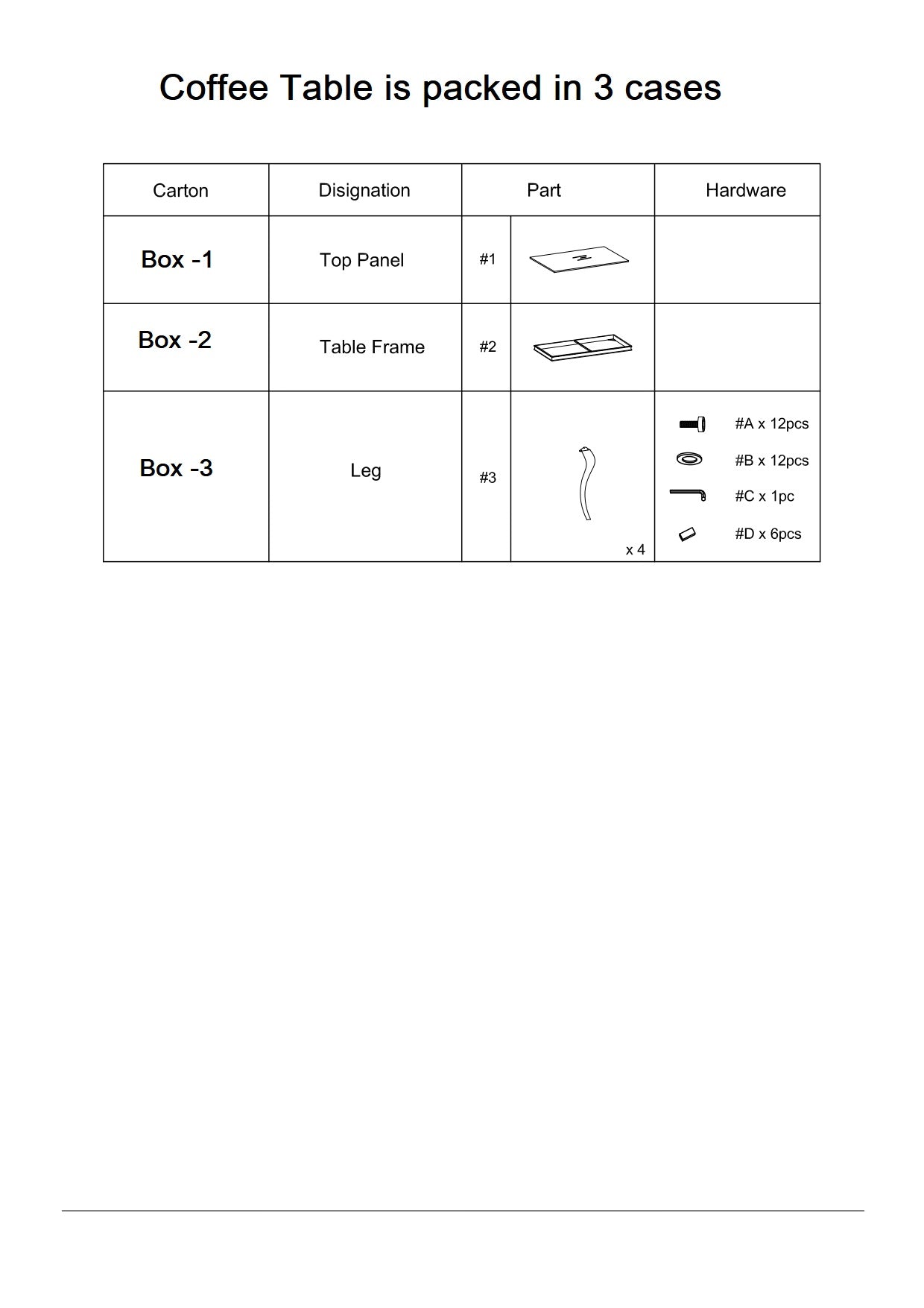 - Includes: One (1) coffee table. Simple assembly required—hardware and instructions included.