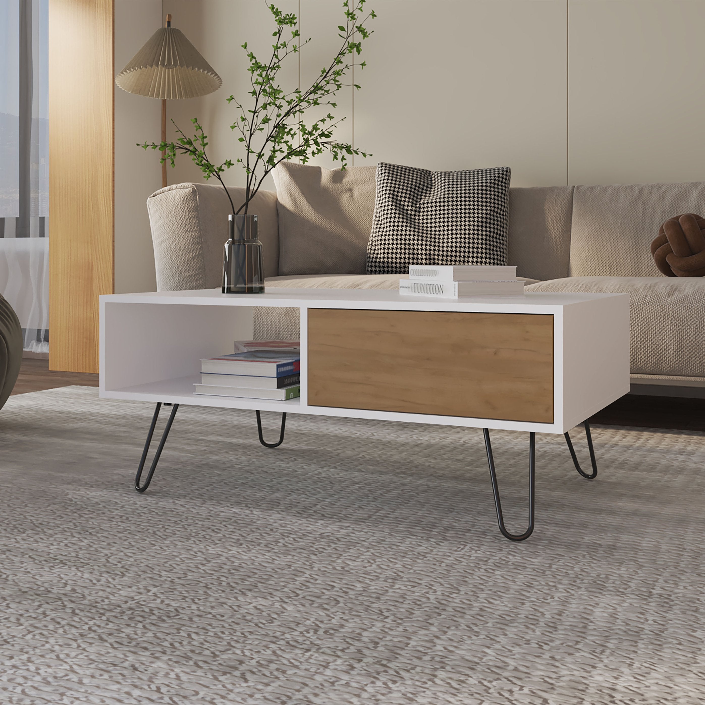 Elevate your living space with a sleek, modern coffee table that blends contemporary design with practical storage. Clean lines, a bright white top paired with natural oak accents, and minimalist hairpin legs create a light, airy look while providing versatile surface and storage options for everyday living and entertaining.
