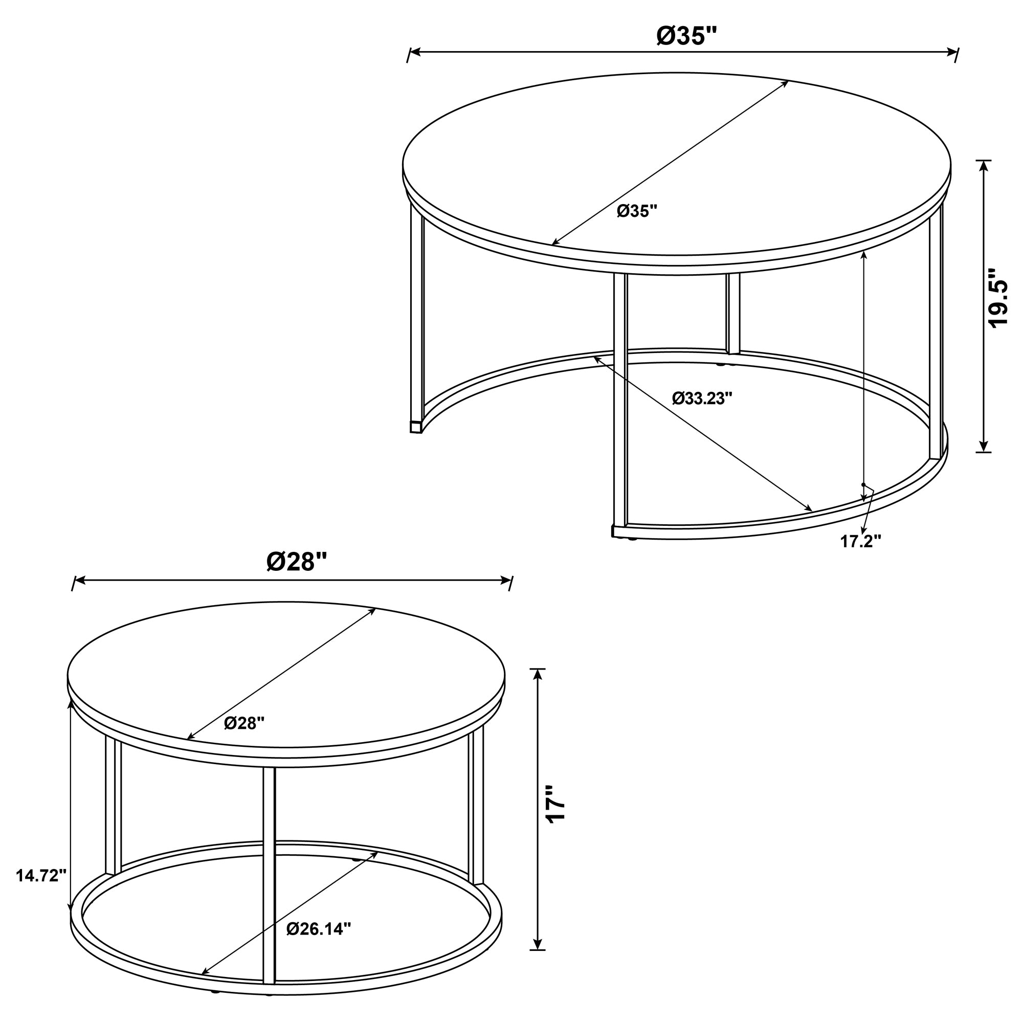 - Dimensions: 19.5 in H x 35 in W x 35 in D (main coffee table)