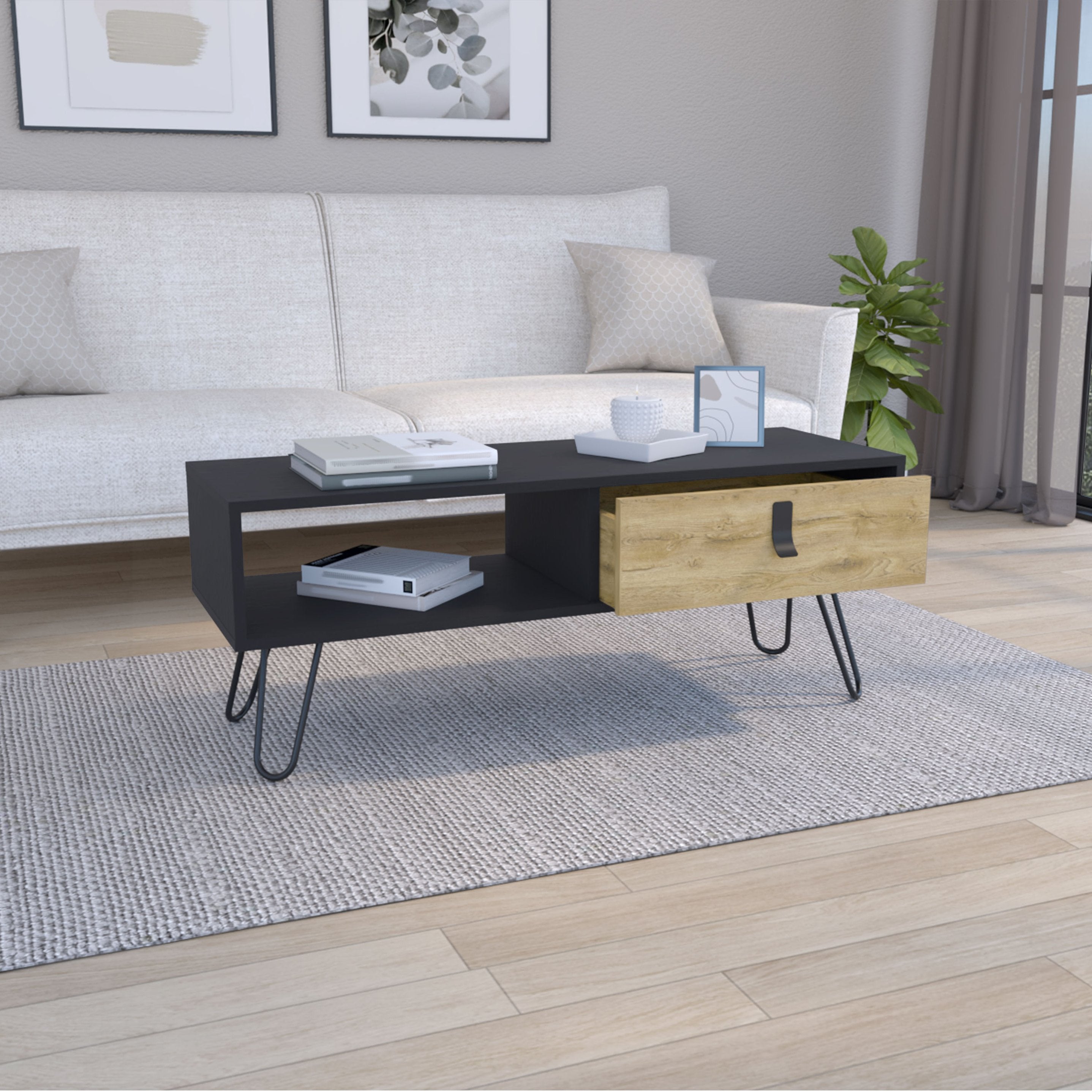 Transform your living space with a modern, functional coffee table that blends clean mid-century styling with practical storage. The multicolor Huna Coffee Table features chic hairpin legs, a dual-tone black/macadamia finish, and thoughtfully configured shelving to keep remotes, books, and media neatly organized while offering a generous surface for entertaining or relaxing.