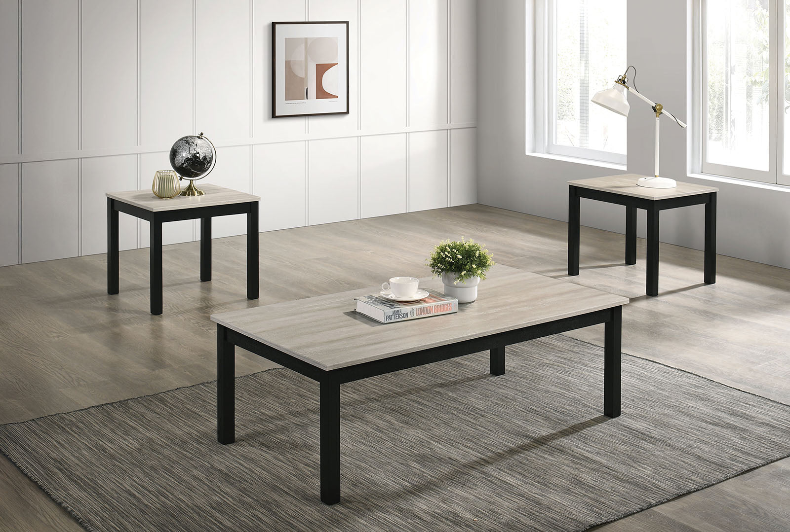 Bring modern simplicity and everyday functionality to your living room with this 3-piece table set. The light gray replicated wood tops and solid wooden legs create a neutral, contemporary look that complements a variety of décor styles while providing sturdy surfaces for drinks, décor and daily use. Easy to assemble and thoughtfully proportioned, this set balances style and practicality for primary living spaces.