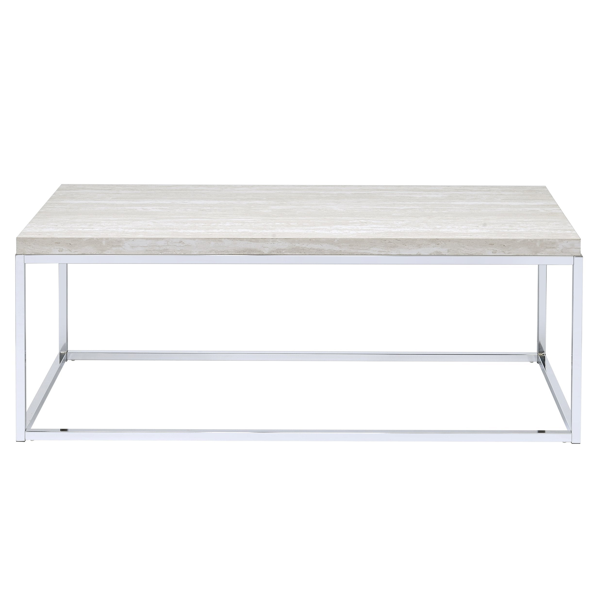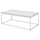 This light oak and chrome coffee table blends contemporary style with practical function, offering a sleek centerpiece for living rooms, offices, or reception areas. Its rectangular engineered-stone top and open sled base create an airy, modern silhouette while the chrome-finished metal frame provides stability and a polished contrast to the light oak surface. The knock-down design allows for simple assembly and convenient transport, making it versatile for different room layouts and easy to move when redecorating.