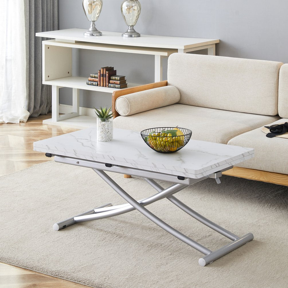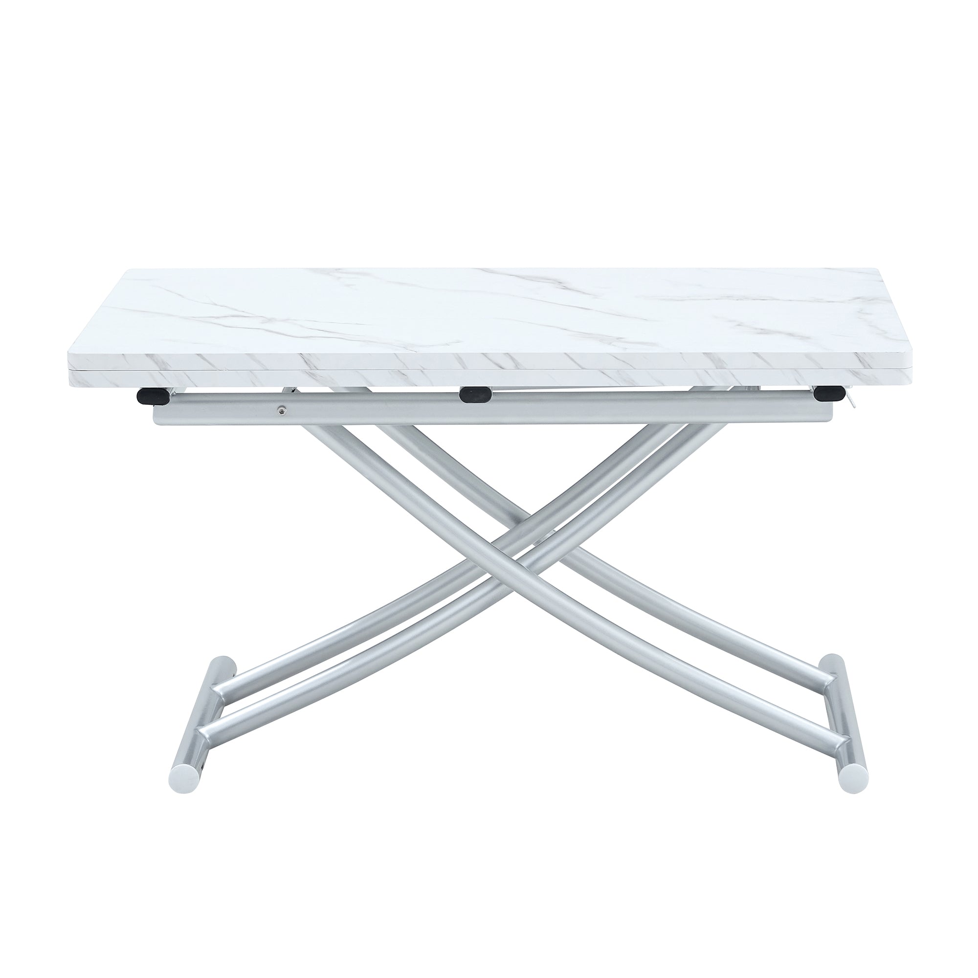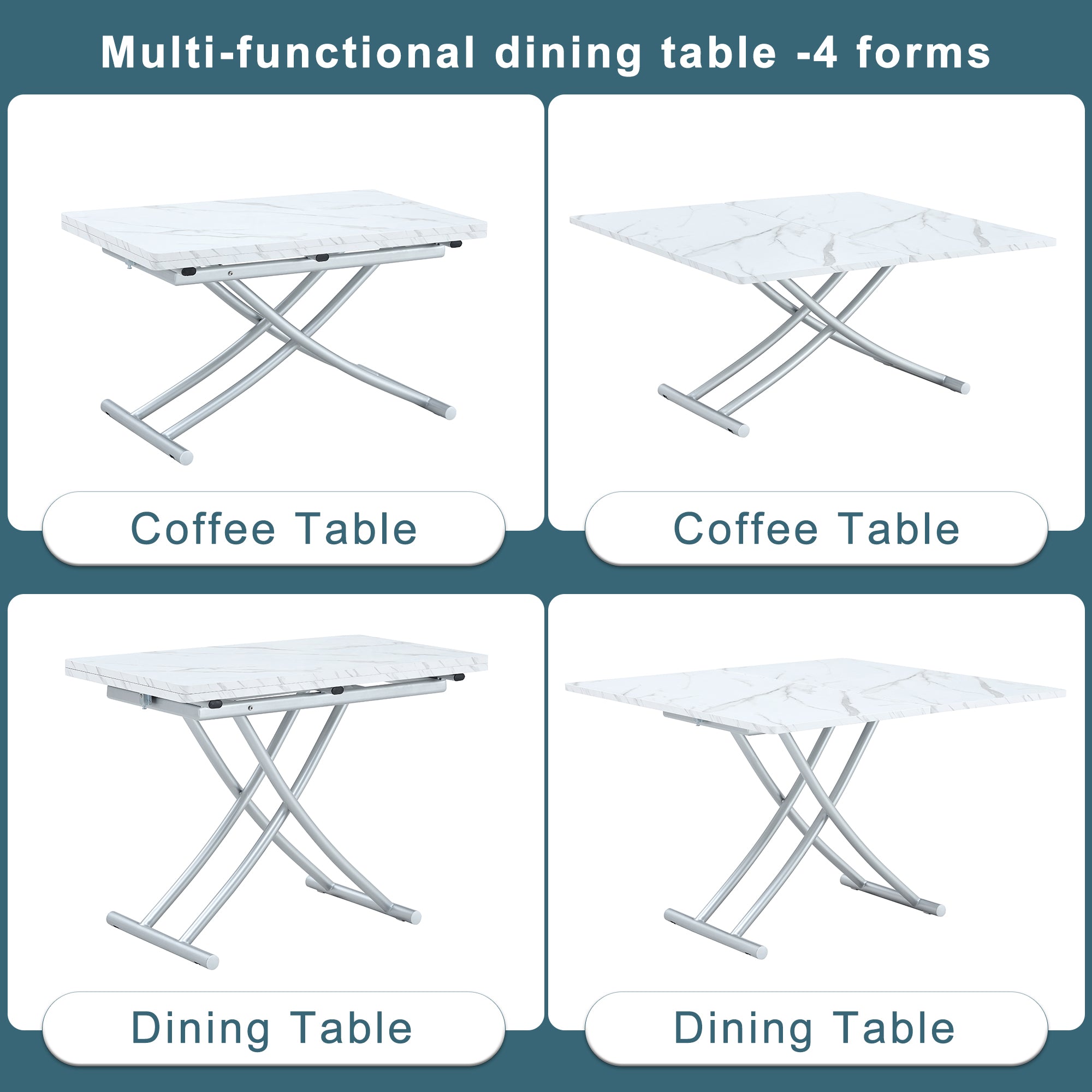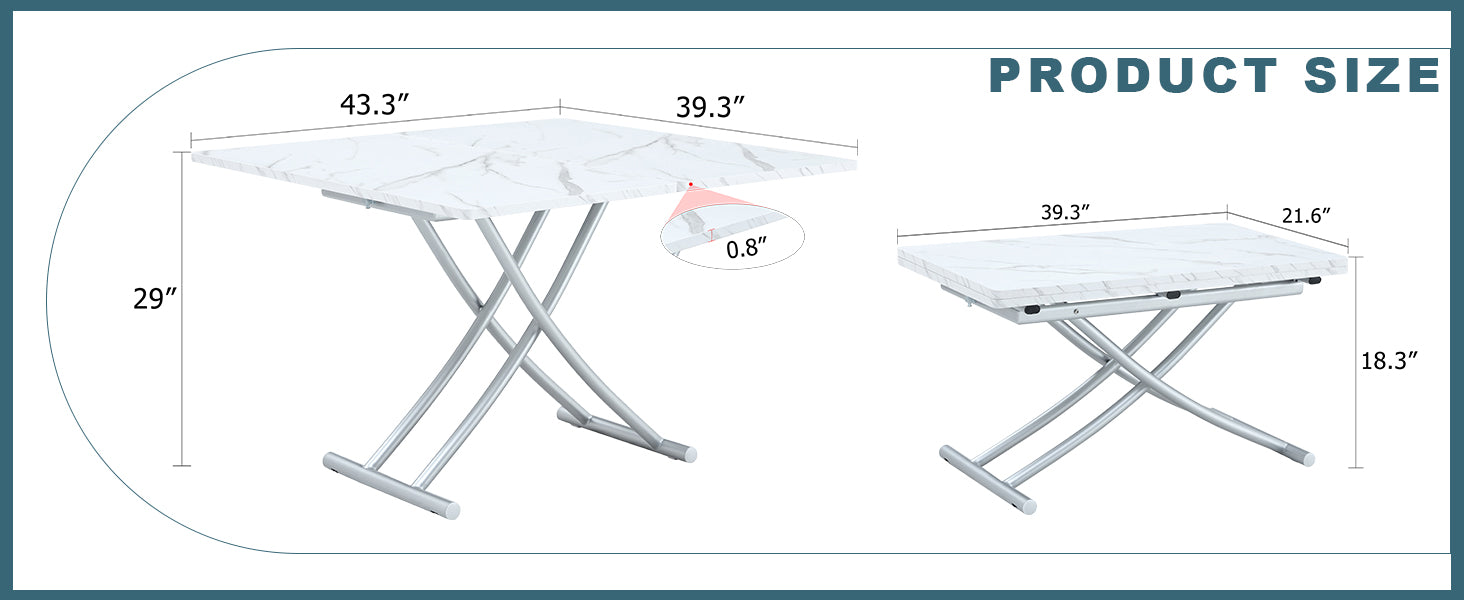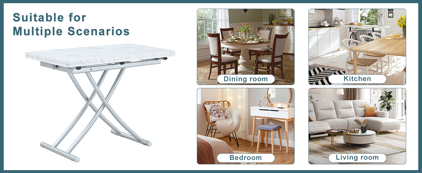 - Modern minimalist multifunctional lift table with 0.8 inch MDF desktop and silver metal legs, can be used as a dressing table, coffee table, dining table, and office tableThe table legs can be adjusted from 18.3 inches to 29 inches in height.