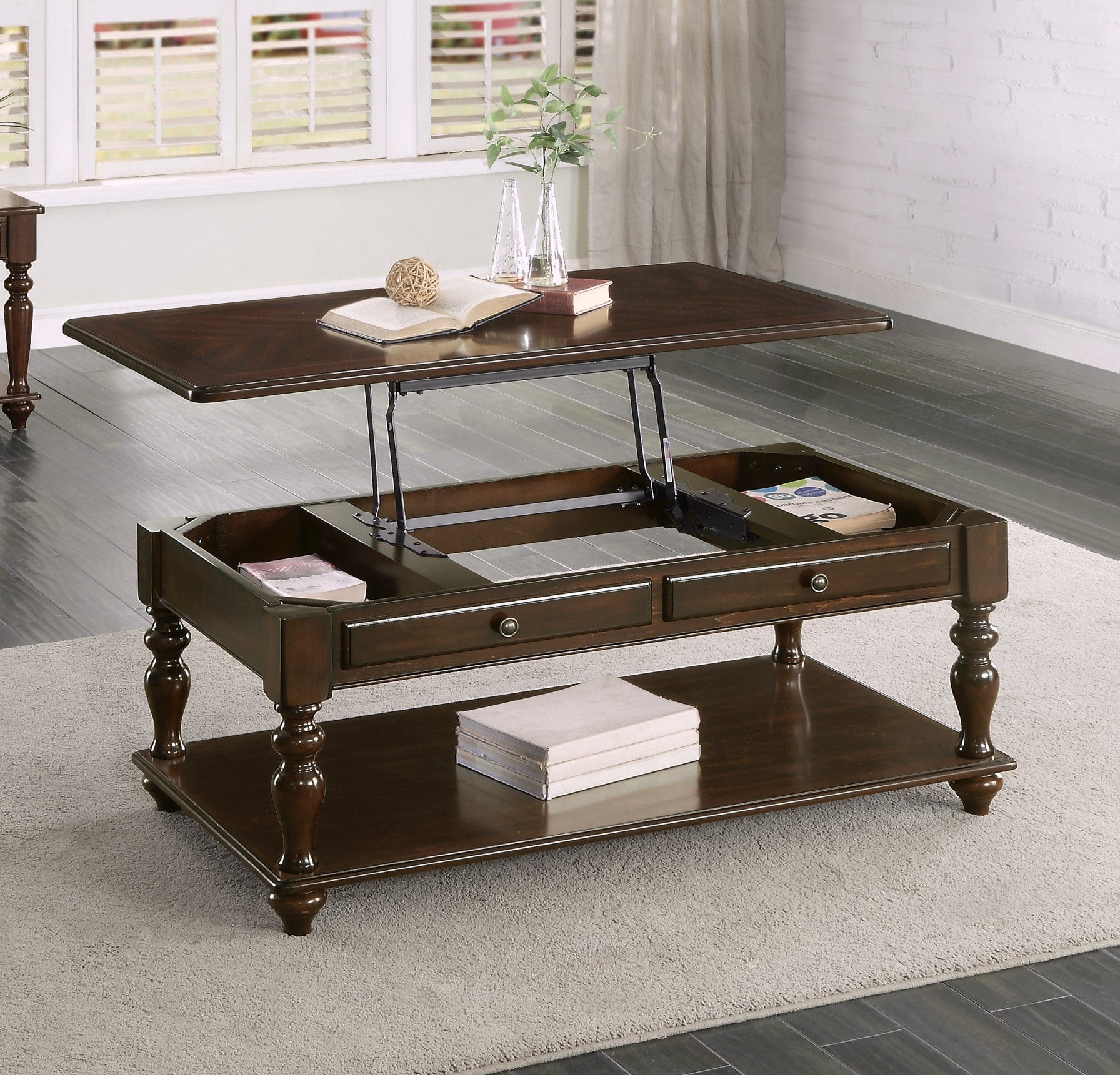 Enhance your living room with this Modern Traditional lift-top cocktail table that blends classic details and practical design. The Lovington-inspired piece features turned legs, an espresso finish, and a caster-supported lift-top for easy access to storage and versatile use as a workspace or serving area. Thoughtfully designed for both style and function, it pairs well with coordinating end tables (sold separately).