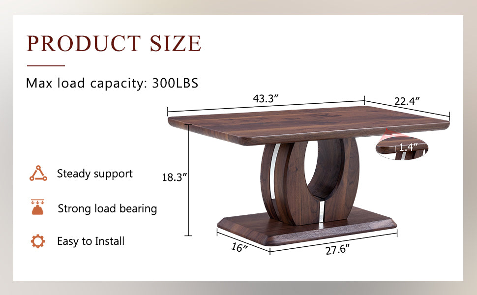 - Walnut color grain stickers Design: The coffee table is made of MDF material with Walnut grain stickers, simple yet elegant.Silver Plated Decorative Strips: The support part is adorned with silver plated decorative strips, adding a touch of luxury to the coffee table.