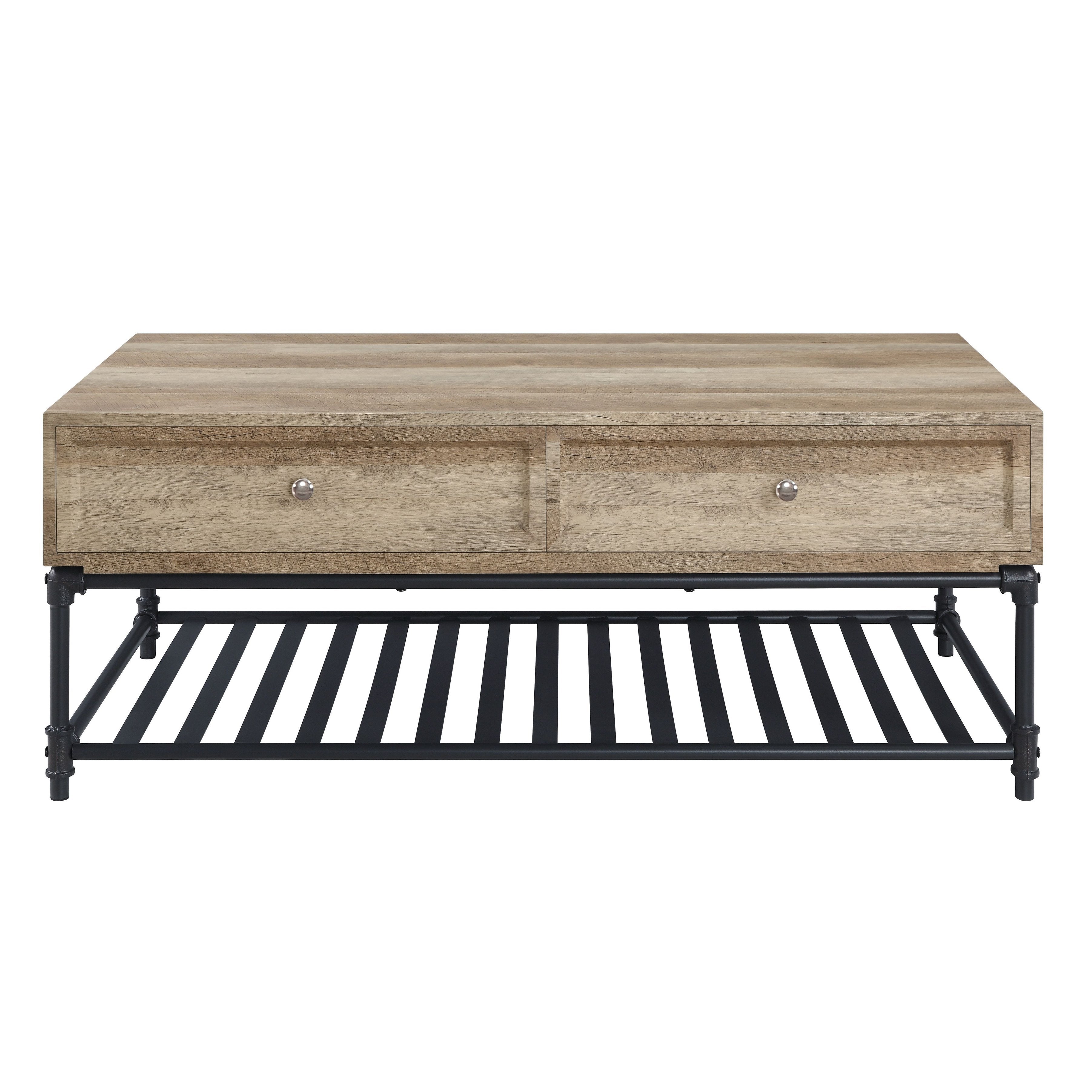 Bring modern industrial style and practical storage to your living room with this oak and sandy black coffee table. Designed for everyday use, it pairs warm oak tones with a sandy black metal frame to create a balanced, contemporary look. The open bottom shelf offers easy access to books, baskets, and décor while the solid top provides a dependable surface for drinks and display items — combining form and function for organized, stylish living spaces.