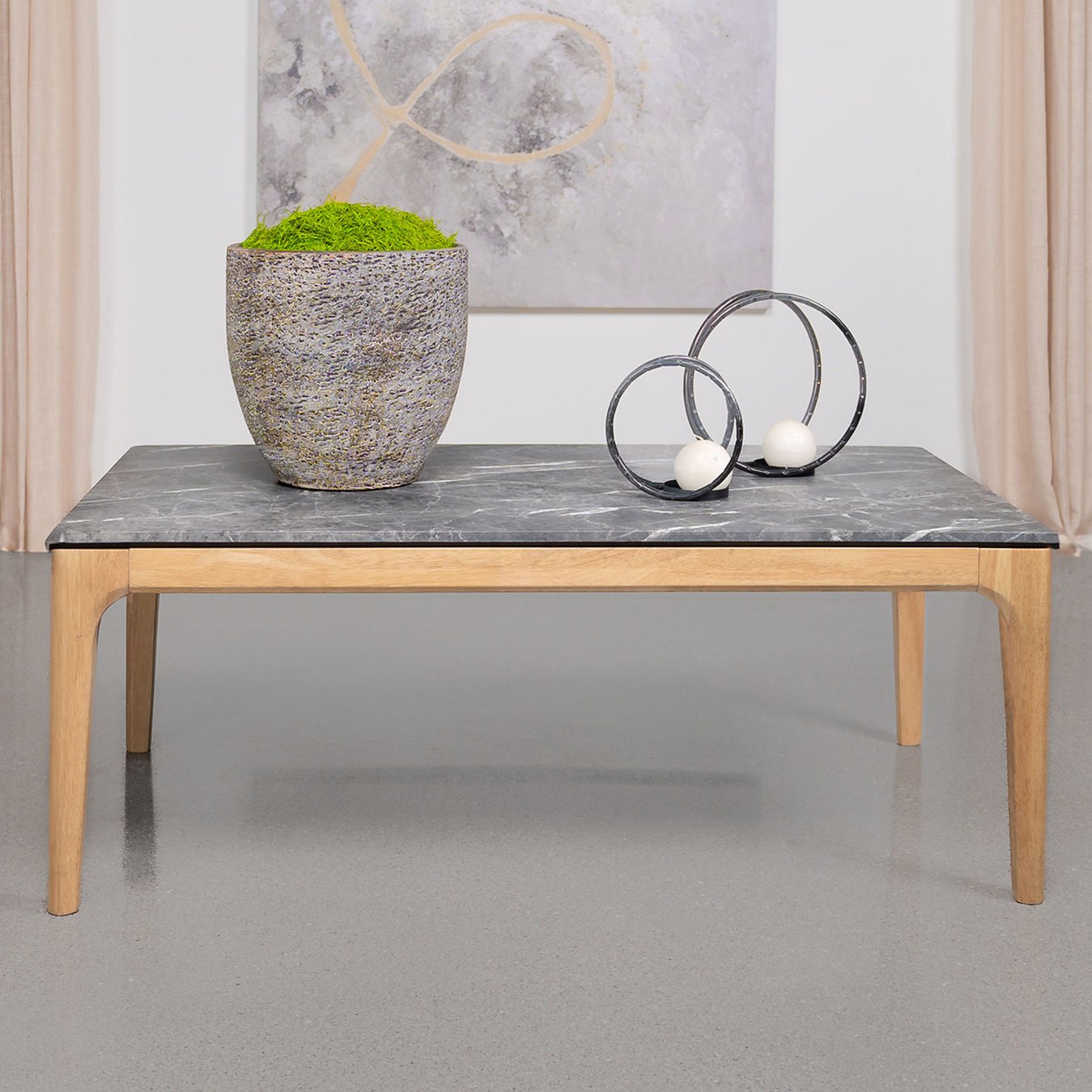 Elevate your living space with a mid-century modern coffee table that blends the elegant look of marble with practical durability. Its rectangular faux marble top and warm light oak base create a refined, versatile centerpiece that complements contemporary and classic interiors alike. Designed for everyday use, this table provides a stylish surface for display, entertaining, and daily living.