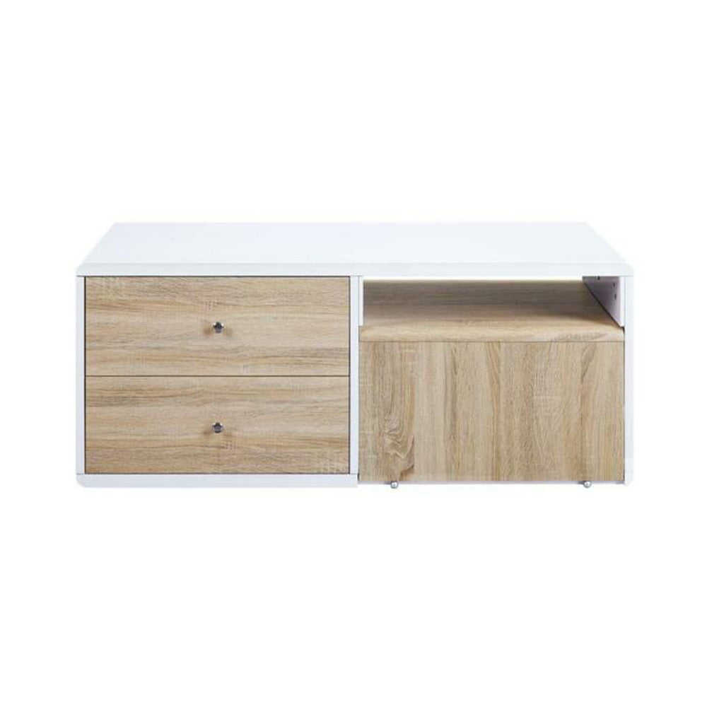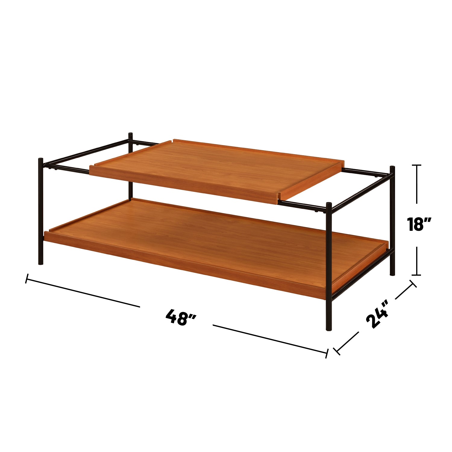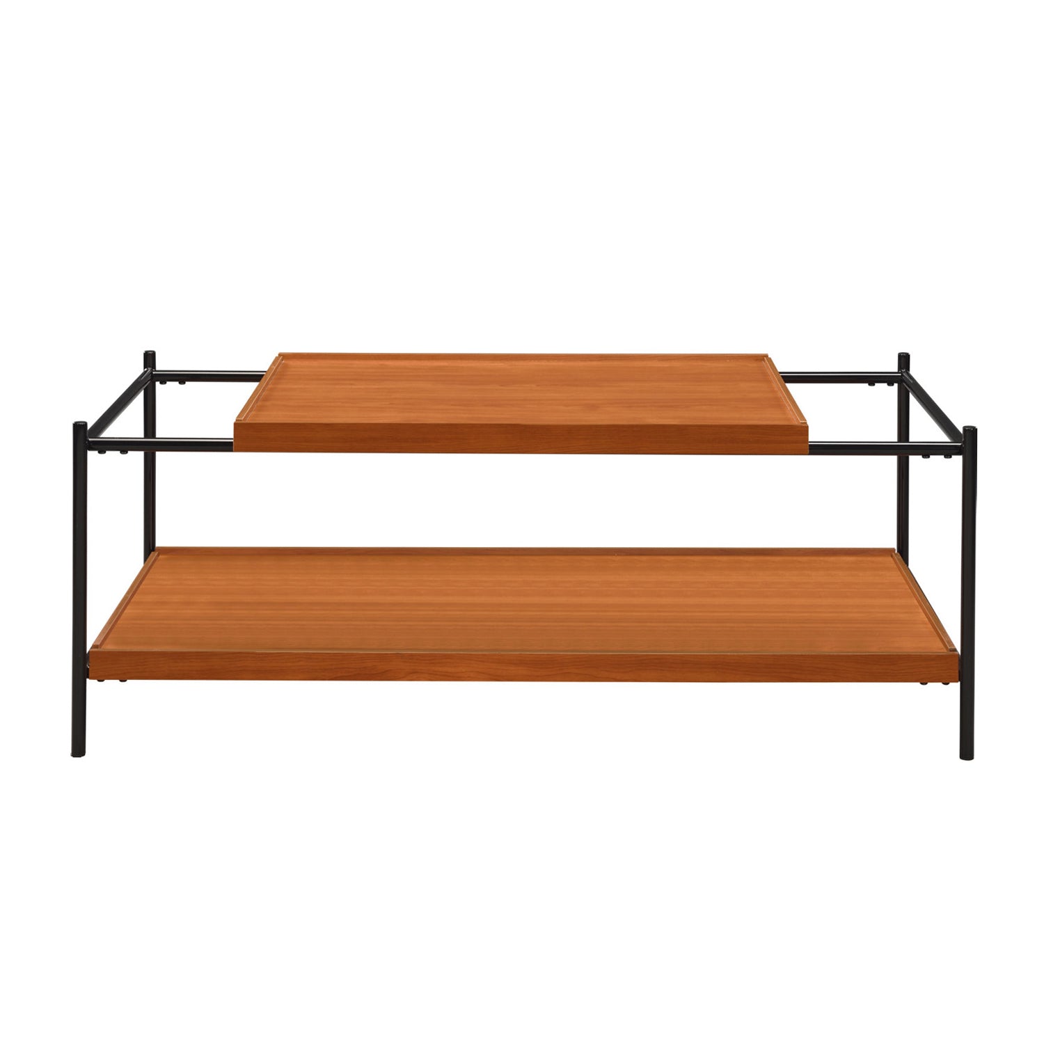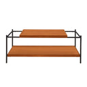 Bring contemporary warmth to your living room with this sleek rectangular coffee table. The two-tone honey oak top and black metal frame create a balanced mix of natural texture and industrial style, while the lower wooden shelf adds practical storage for books, remotes, and decor. Its clean lines and durable construction make it an ideal focal point for modern and transitional interiors.