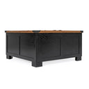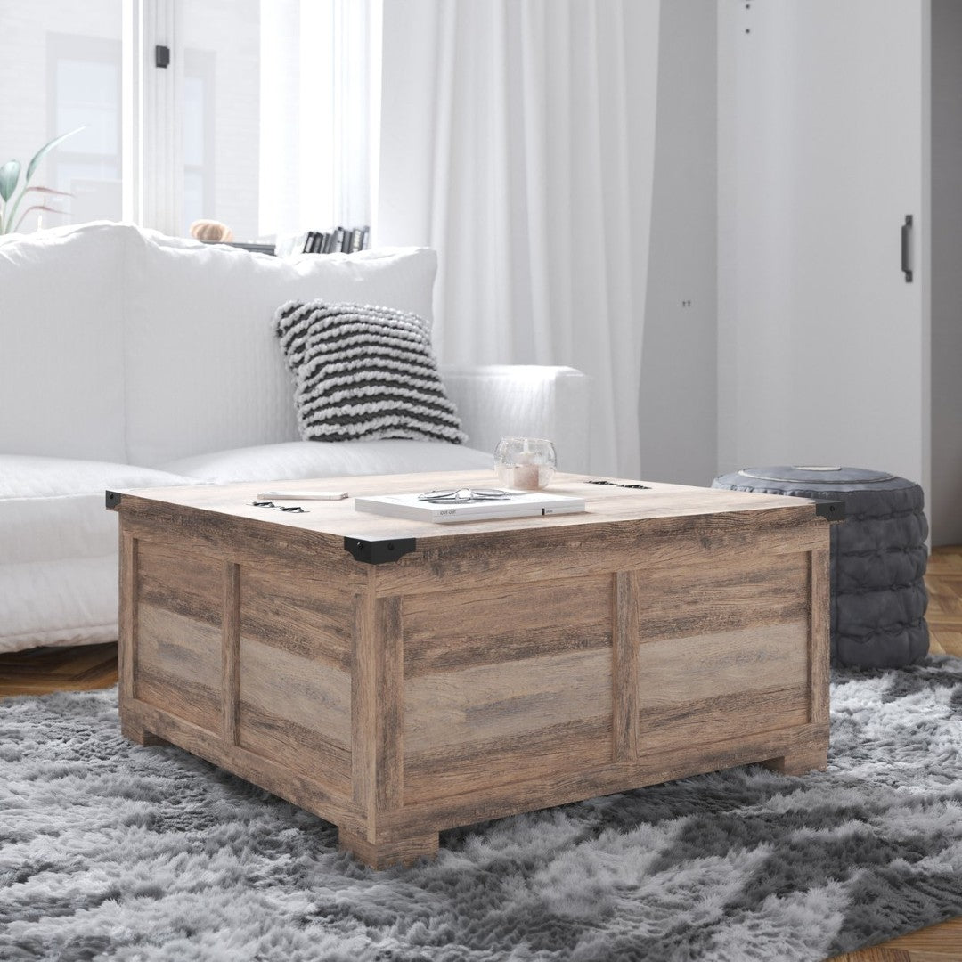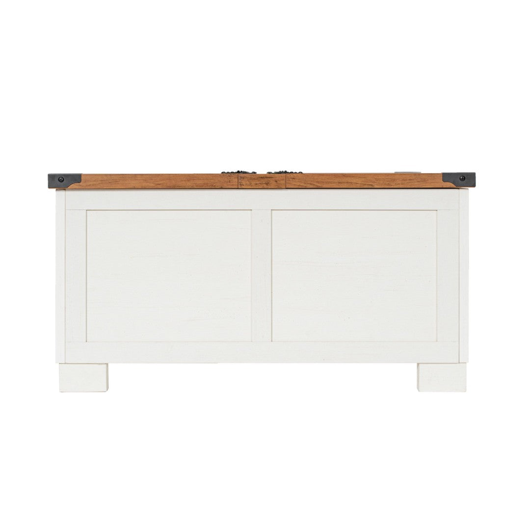 Bring farmhouse warmth and smart functionality to your living room with this spacious Wyatt coffee table. Its two-tone black and rustic oak finish, metal corner accents, and dual hinged lift tops create a stylish focal point while offering generous hidden storage and a sturdy surface for everyday use — ideal for entertaining, family game nights, or keeping living spaces tidy.