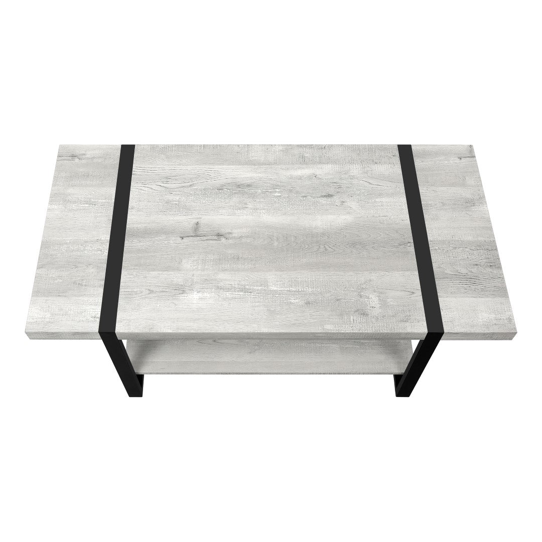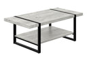 - Industrial-farmhouse style rectangular coffee table with a fixed shelf for additional storage
