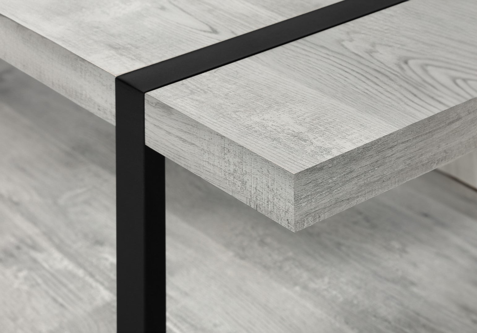 - Thick, wide tabletop and smaller lower shelf in a grey reclaimed wood-look finish for a rustic appeal