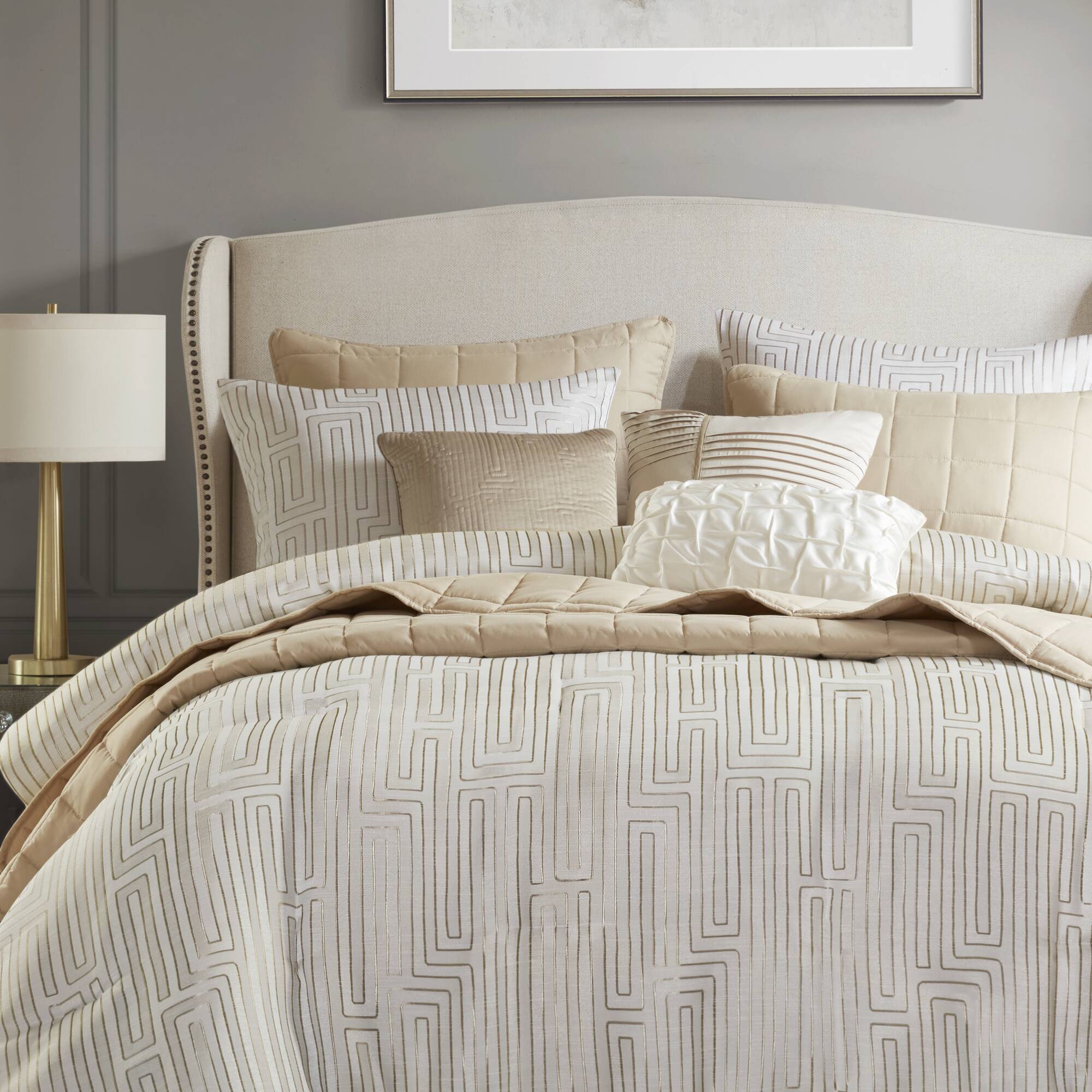 - Materials & fill: Comforter and shams feature a polyester jacquard face with a microfiber solid back and polyester fill for loft and durability. Quilts are microfiber with polyester fill; decorative pillows are polyester.