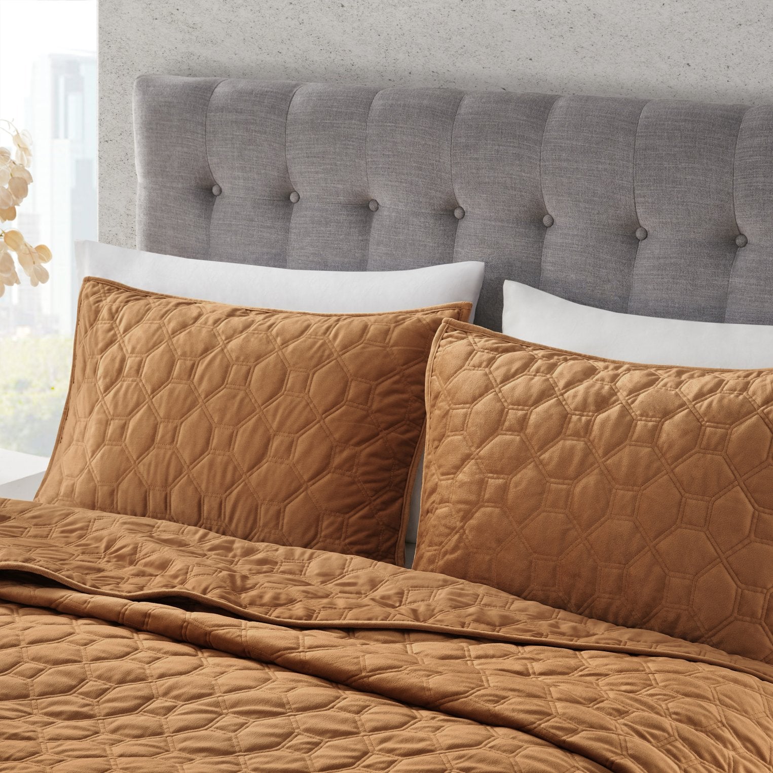 - Materials: Quilt and shams: 100% polyester velvet face with quilted geometric design; microfiber reverse