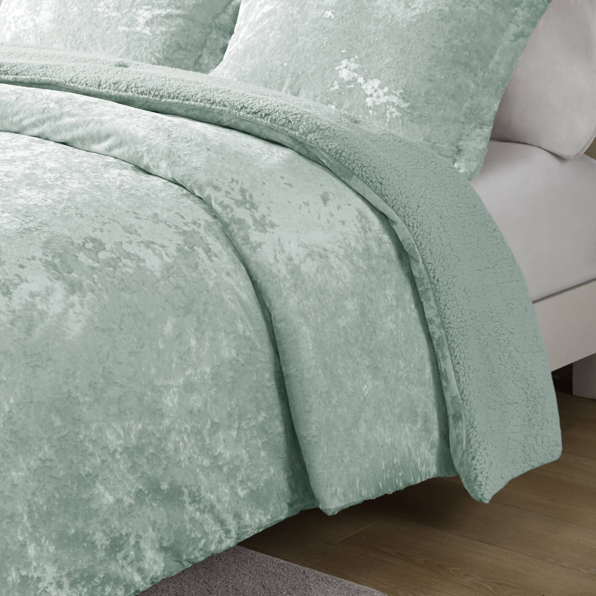 Wrap your bedroom in plush comfort and modern elegance with this 3-piece reversible comforter set. The luxurious crushed velvet face adds a soft sheen and upscale look, while the cozy sherpa reverse provides warmth and texture—perfect for layering. Designed for King/Cal King beds, this set includes the comforter and two coordinating shams for a finished, hotel-quality appearance.