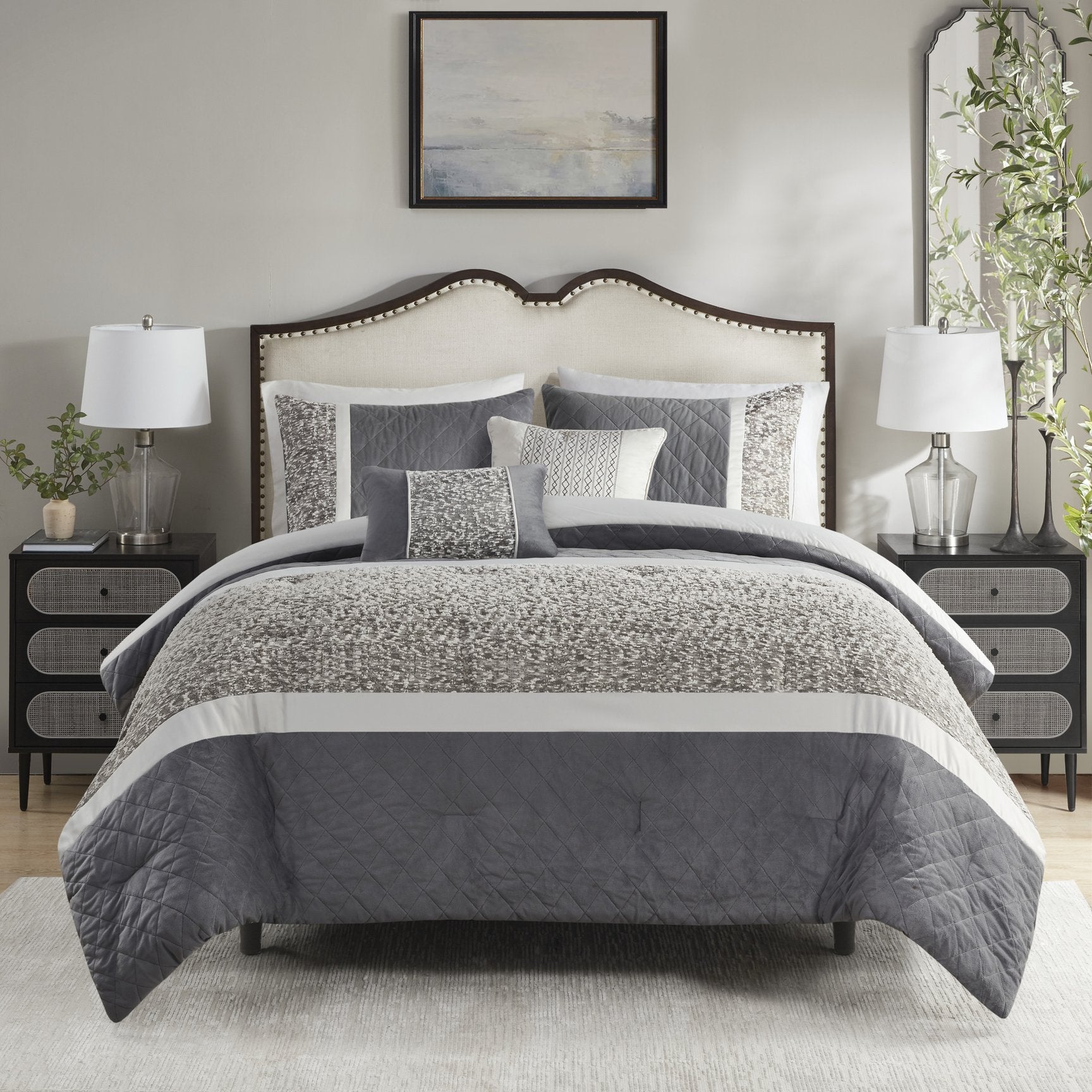 Transform your bedroom into a cozy, sophisticated retreat with this 5-piece textured jacquard stripe comforter set. Designed for both style and everyday comfort, the set pairs a luxuriously quilted comforter and shams with coordinating throw pillows that add depth and visual interest. Durable polyester construction and thoughtful detailing make this set an ideal choice for easy care and lasting use.