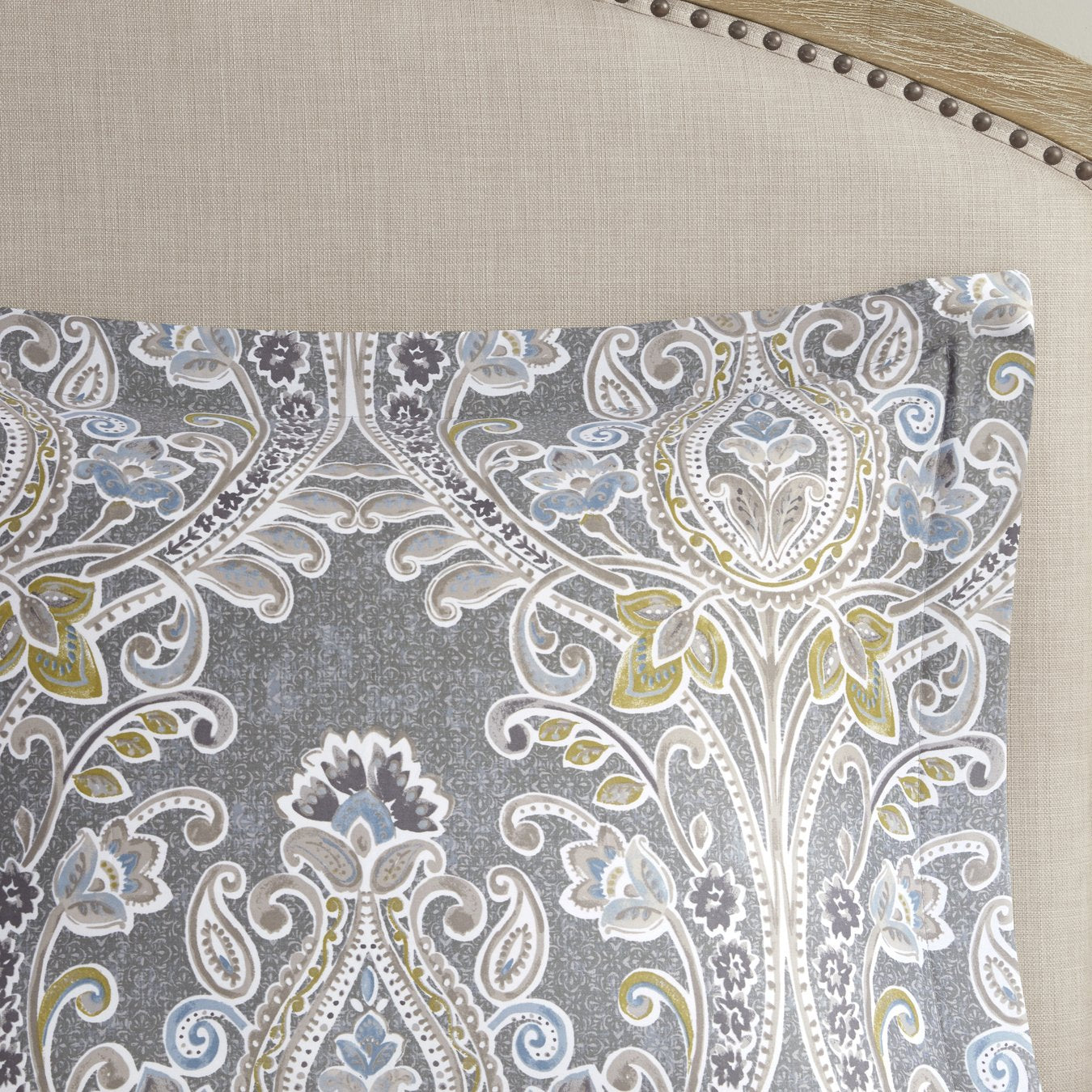 - Features an all over damask pattern in grey hues with hints of blue and yellow