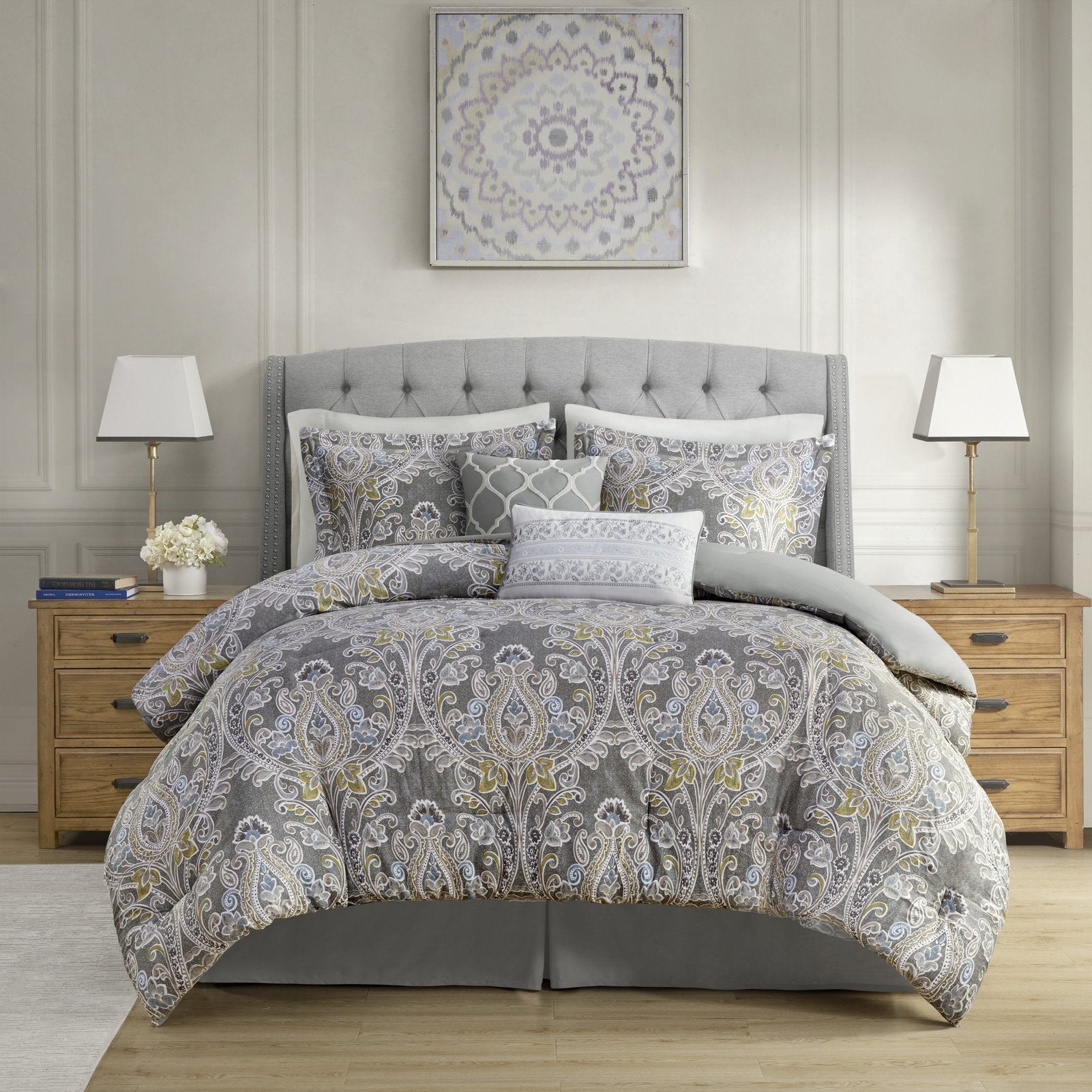 - Design highlights: Oversized, overfilled comforter for plush comfort; damask printed top with solid grey reverse for versatile styling; embroidered decorative pillows add texture and interest