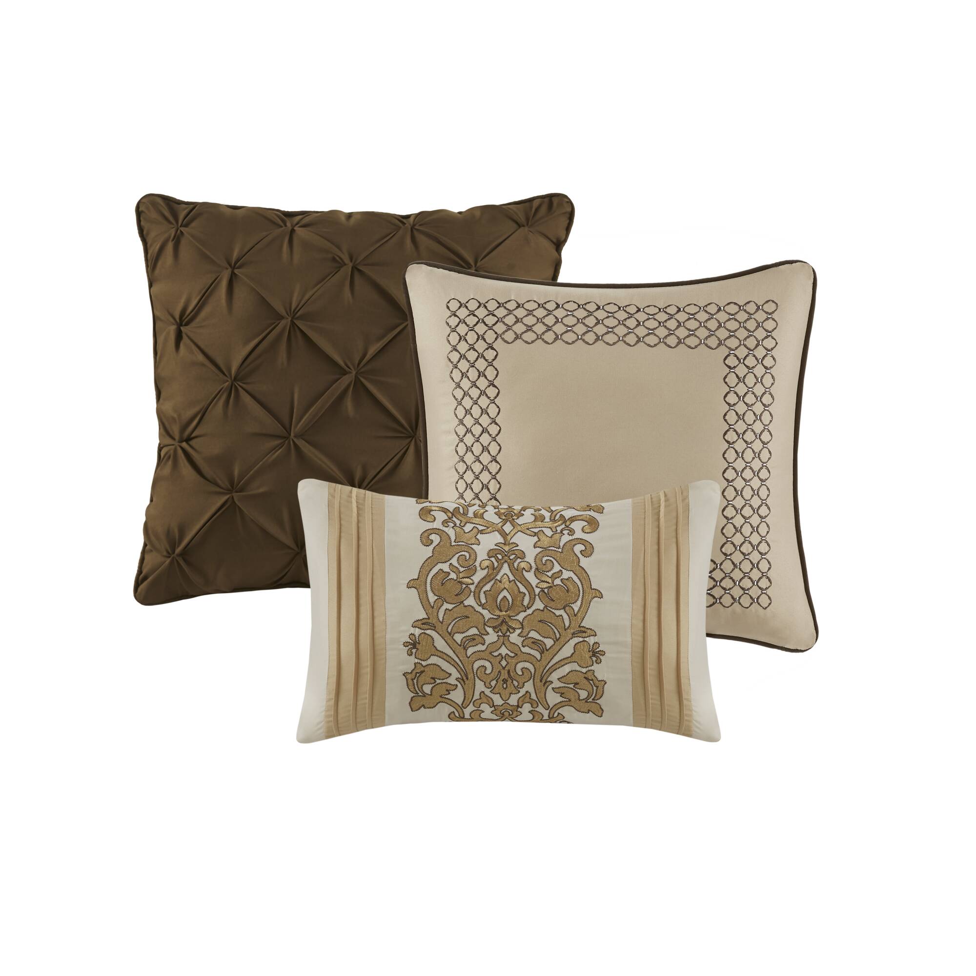 - Set includes: 1 comforter, 2 standard shams, and 3 decorative pillows (one square, one oblong, one smaller square).