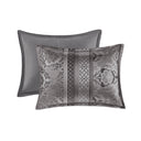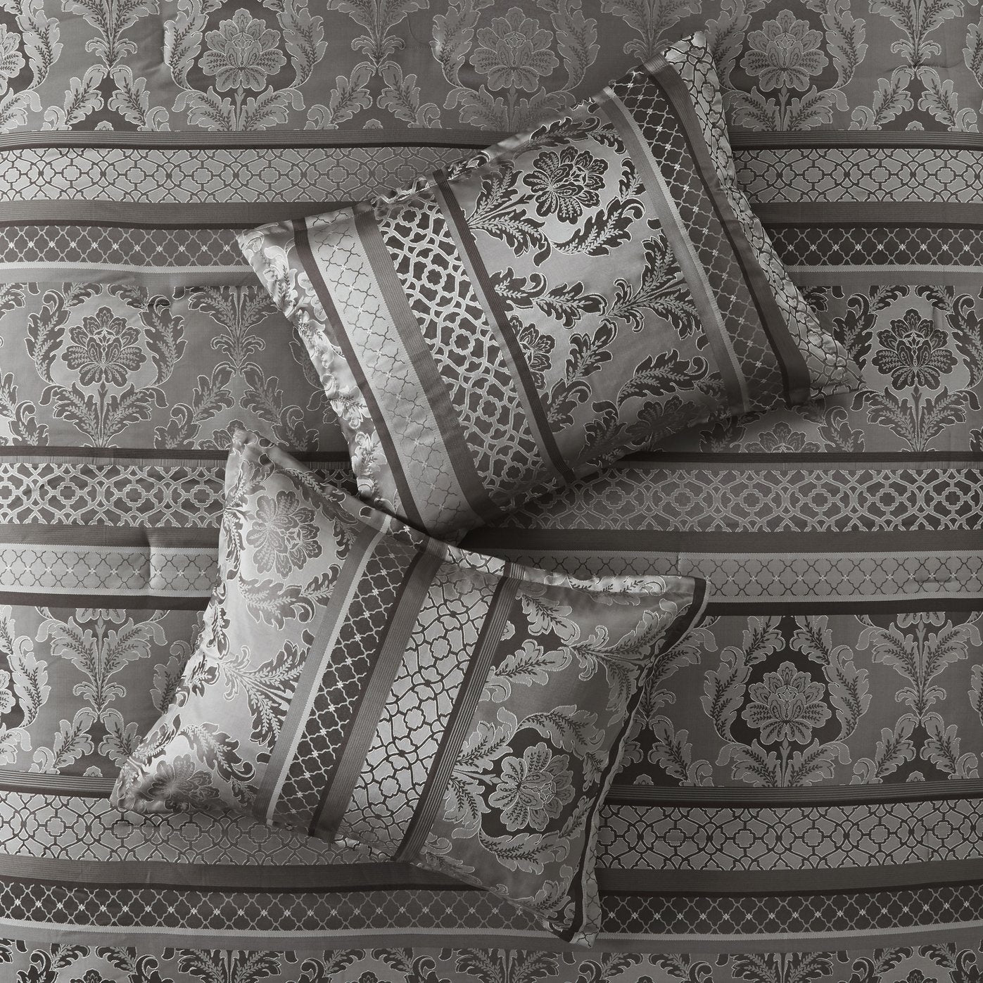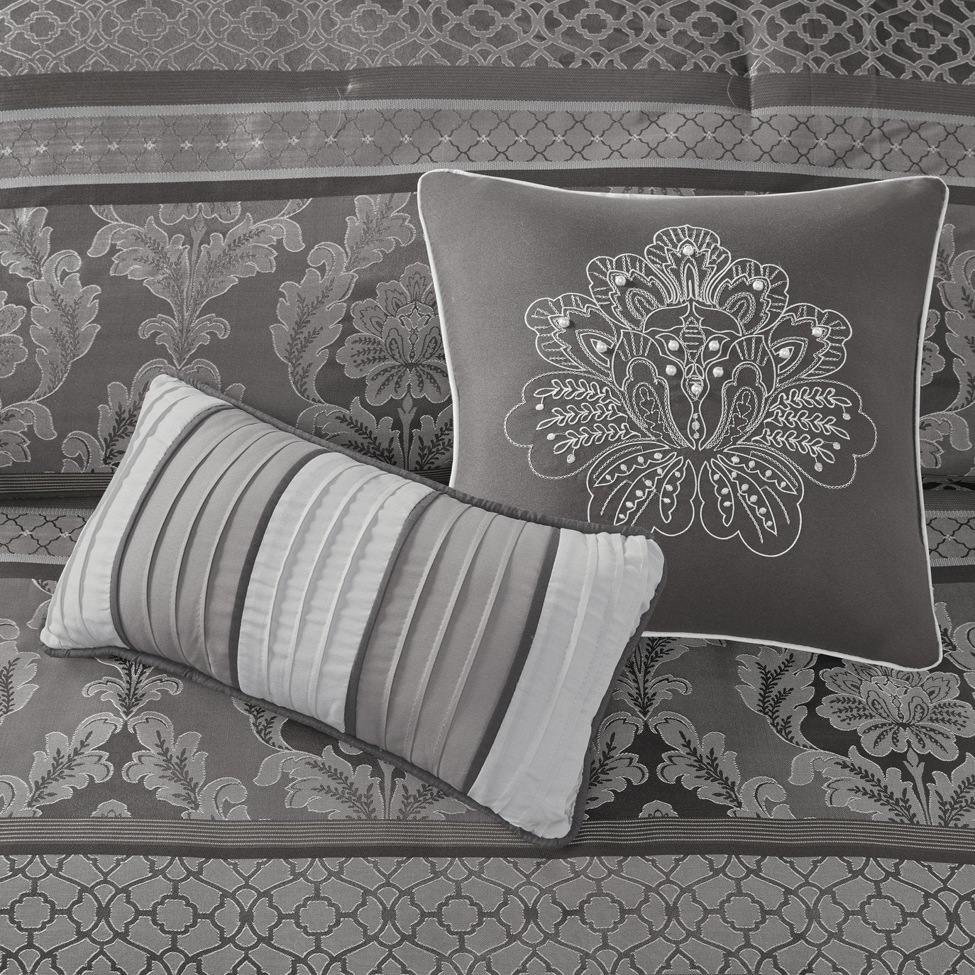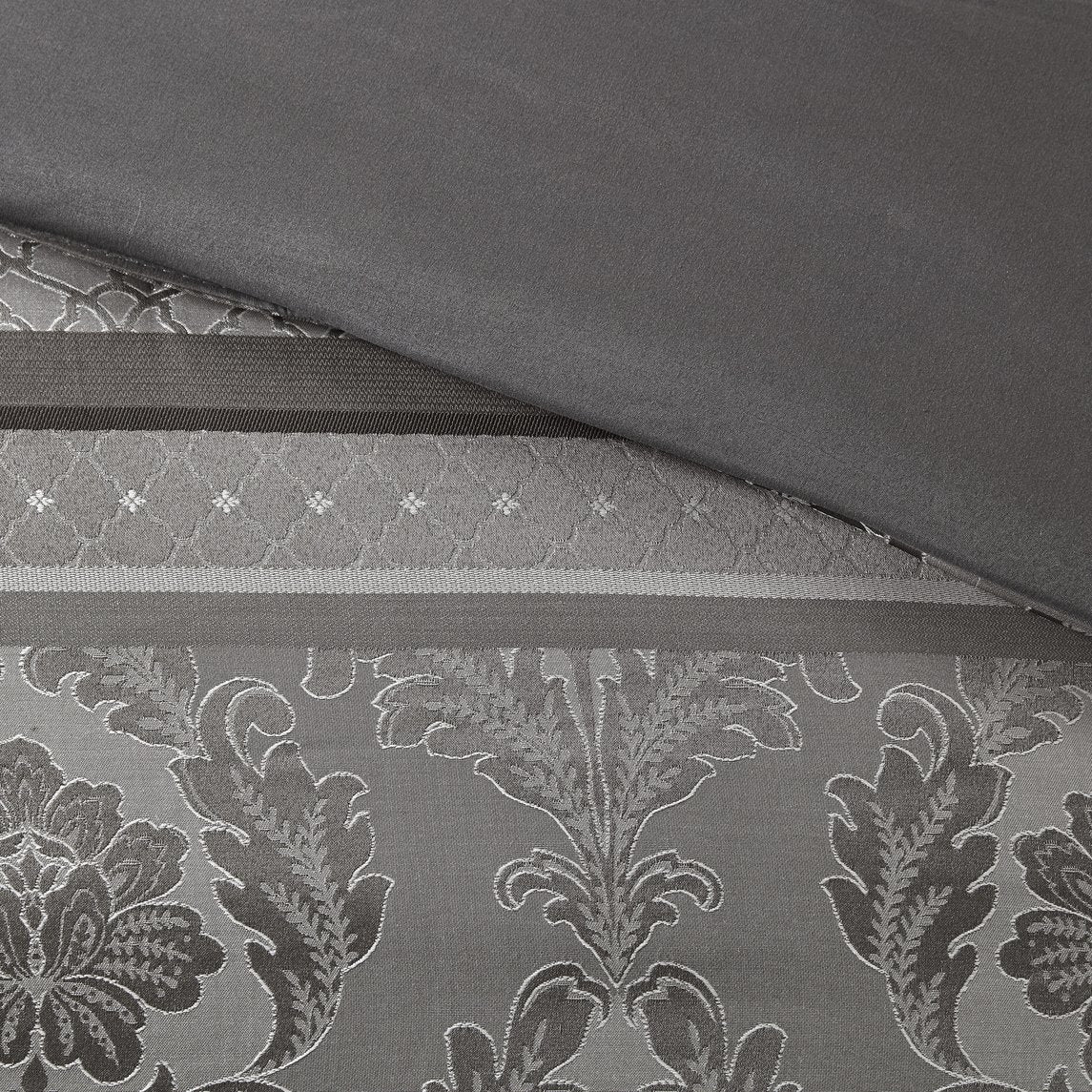 Elevate your bedroom with the Madison Park Bellagio 7-piece comforter ensemble — a sophisticated, coordinated bedding collection that blends textured jacquard patterns with subtle lustre for a refined, hotel-inspired look. Expertly crafted details like embroidered and pleated decorative pillows, a tailored bedskirt, and a reversible comforter make styling effortless while adding depth and comfort to your sleep space.