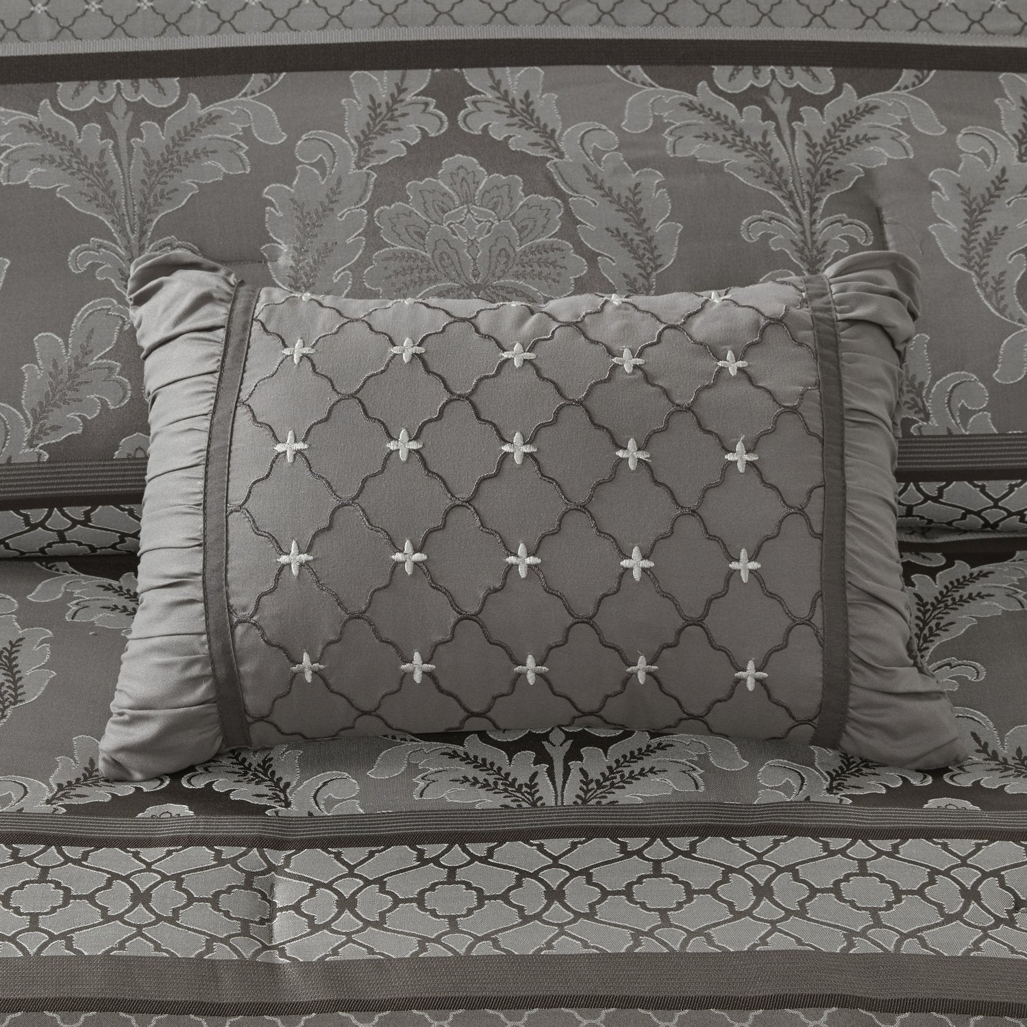 - Materials: Polyester jacquard shell, polyester fill, microfiber bedskirt, with embroidered decorative pillows for added texture.