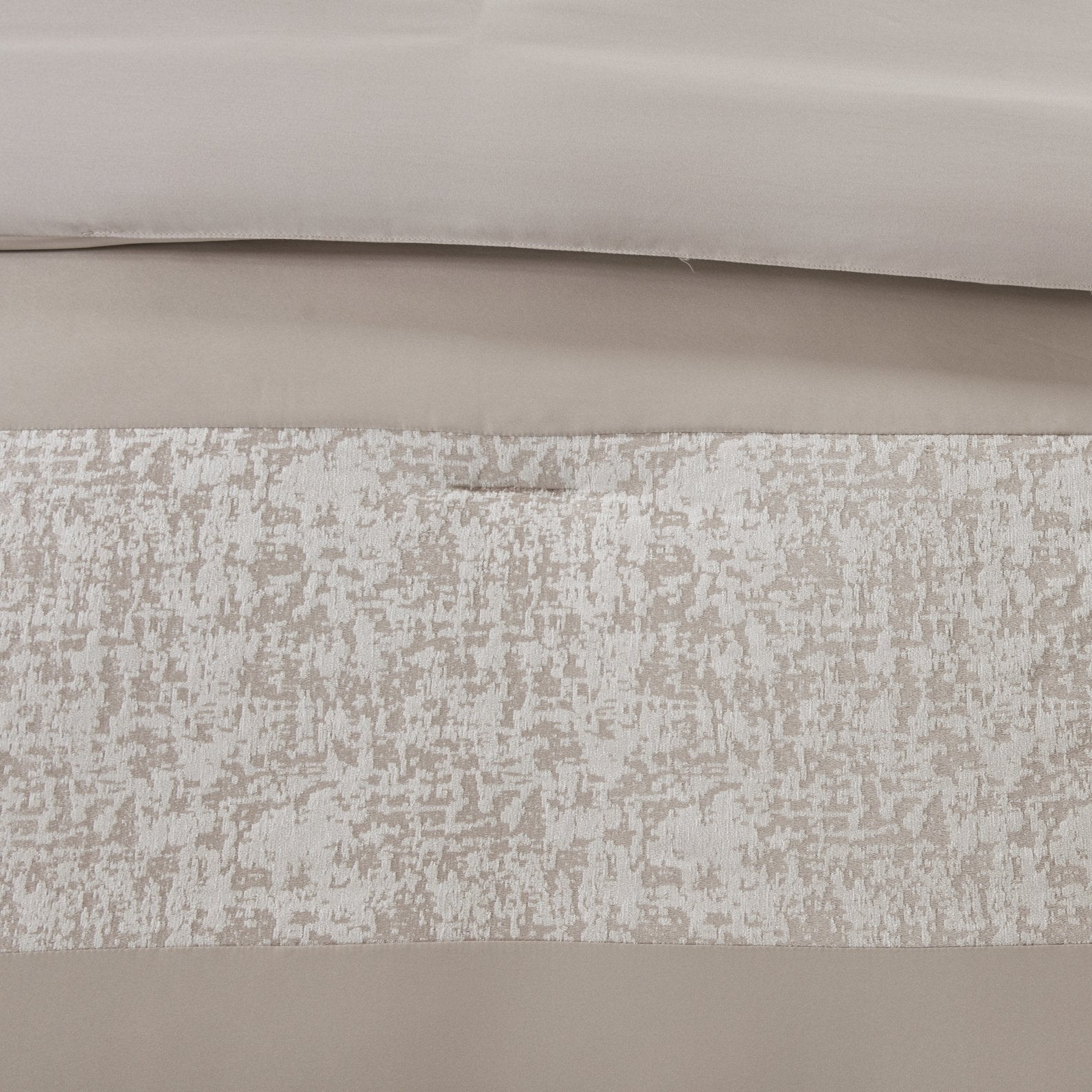 - Luxurious chenille jacquard pieced in taupe matte charmeuse comforter set