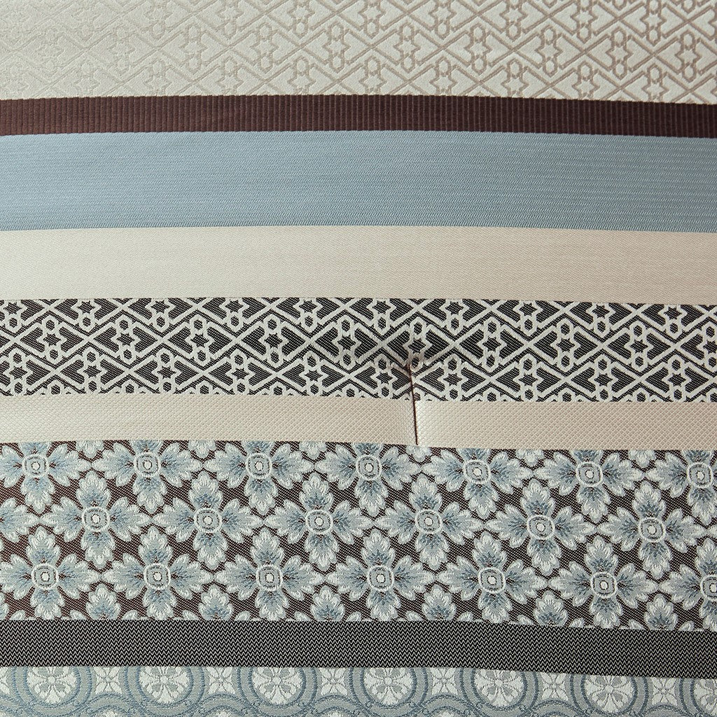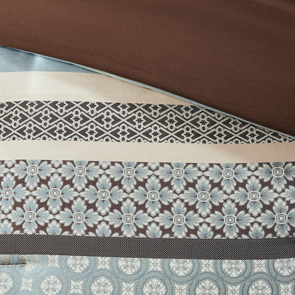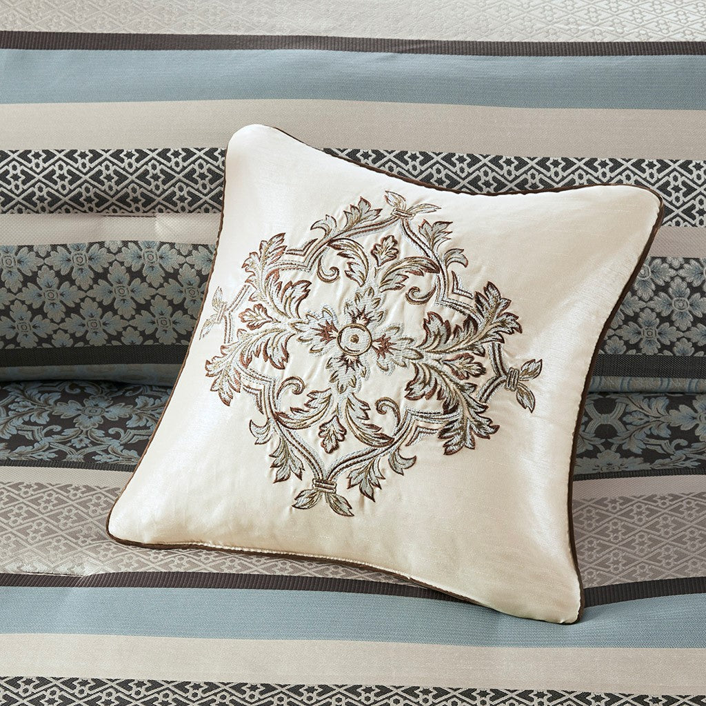 Refresh your bedroom with the Princeton 7-piece comforter set—an elegant blend of geometric and damask motifs in soft blue, grey, and ivory tones. Thoughtfully designed accents and embroidered decorative pillows add texture and visual interest, while durable polyester jacquard and a brushed reverse deliver a soft, easy-care finish. Ideal for a contemporary or transitional bedroom, this coordinated set brings layered style and effortless comfort to your queen bed.