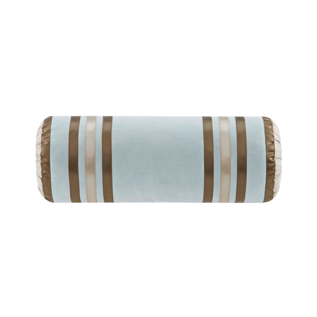 - Design Highlights: Taupe outer border with an inner chocolate accent frames a central light-blue panel for contrast and depth; matching borders on decorative pillows create a cohesive look.