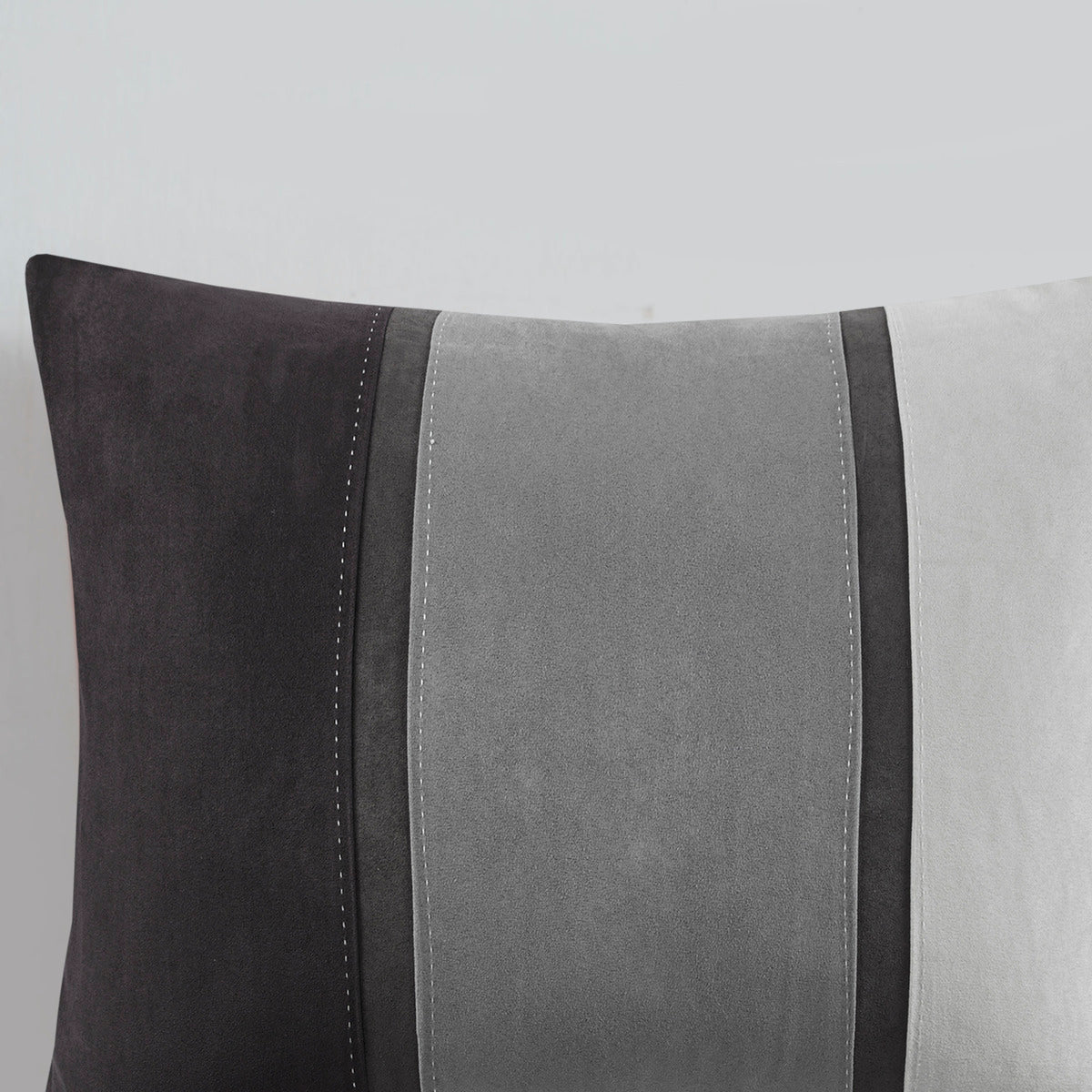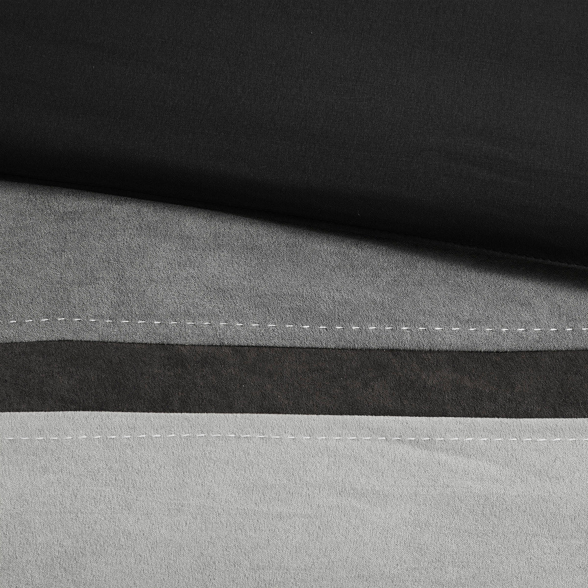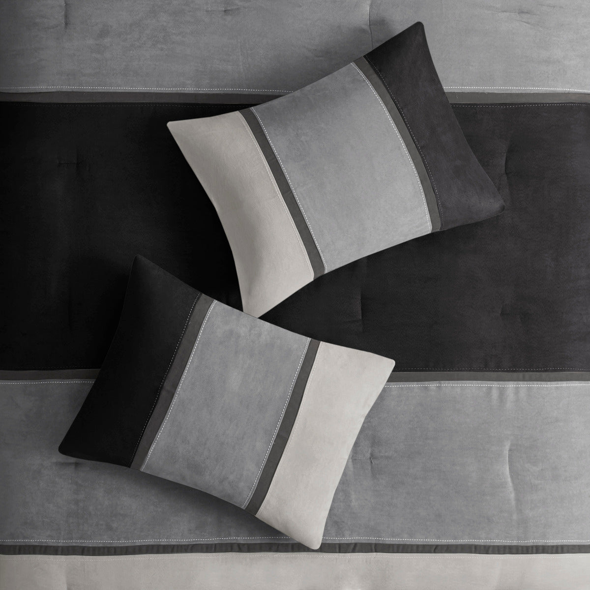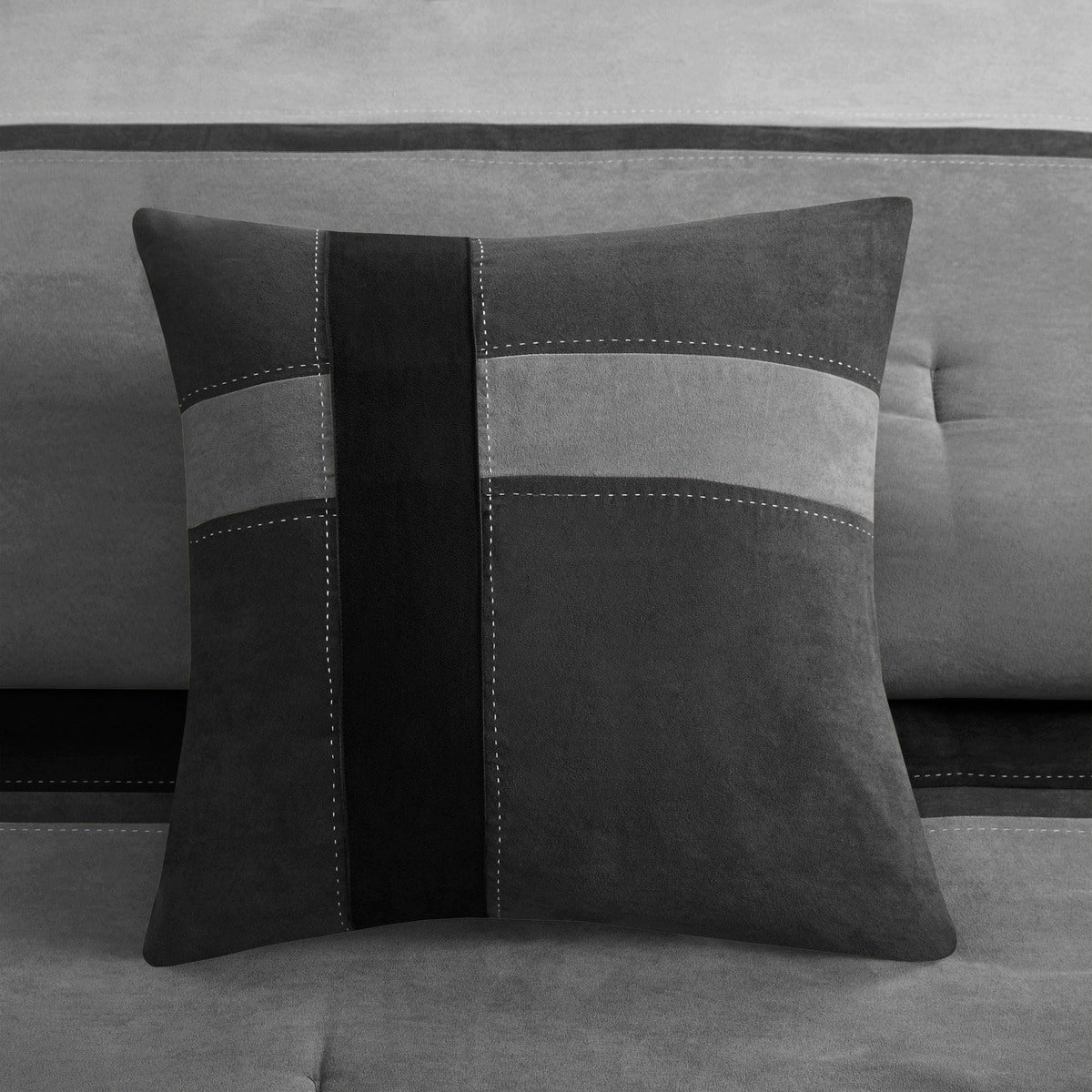 - Design details: Pieced microsuede panels in light grey, charcoal, and black with embroidered accents on decorative pillows; solid black reverse on comforter for a clean, versatile look.