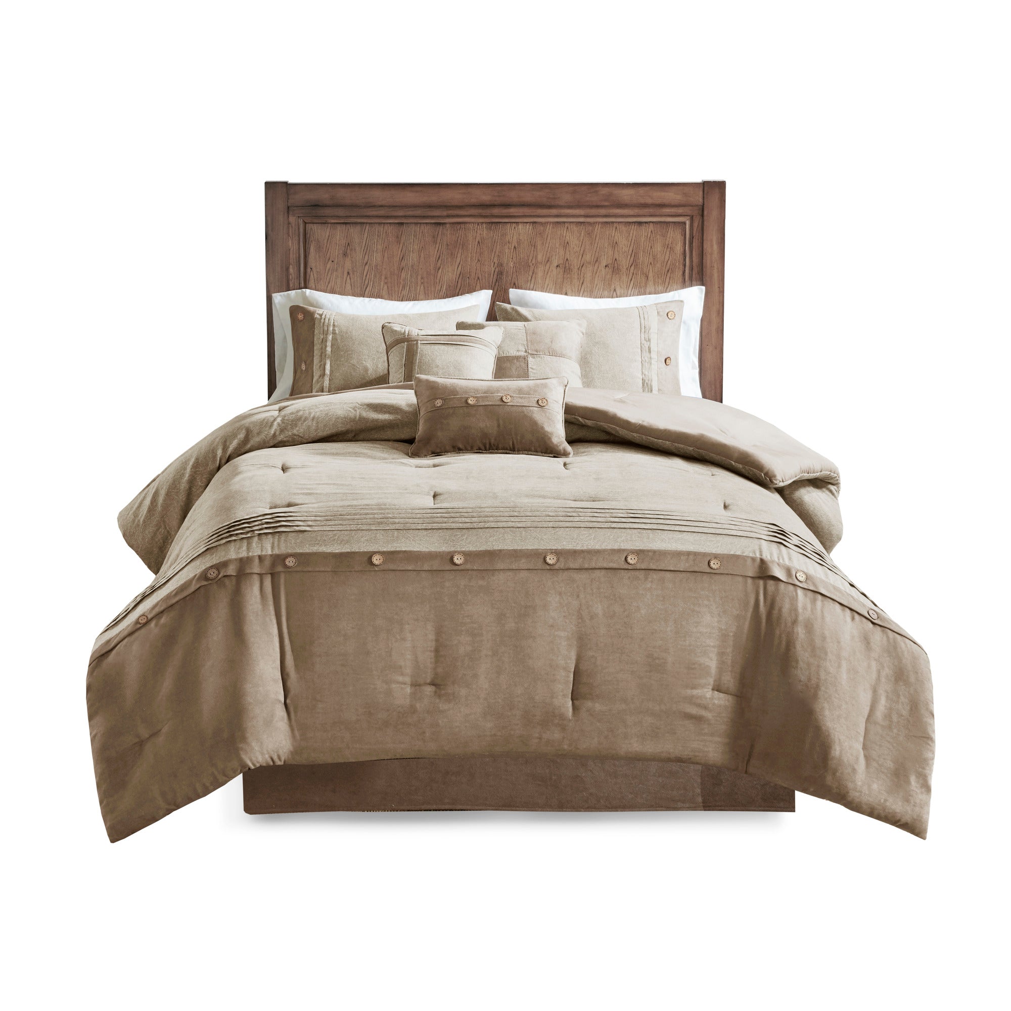 Give your bedroom a warm, lodge-inspired refresh with this 7-piece faux suede comforter set. It blends textured earthy prints with plush polyester microsuede, accented by button detailing and embroidered, pieced decorative pillows for a cohesive, layered look. Machine washable for easy care, the set arrives rolled or compressed—simply fluff or steam iron to remove wrinkles before use.