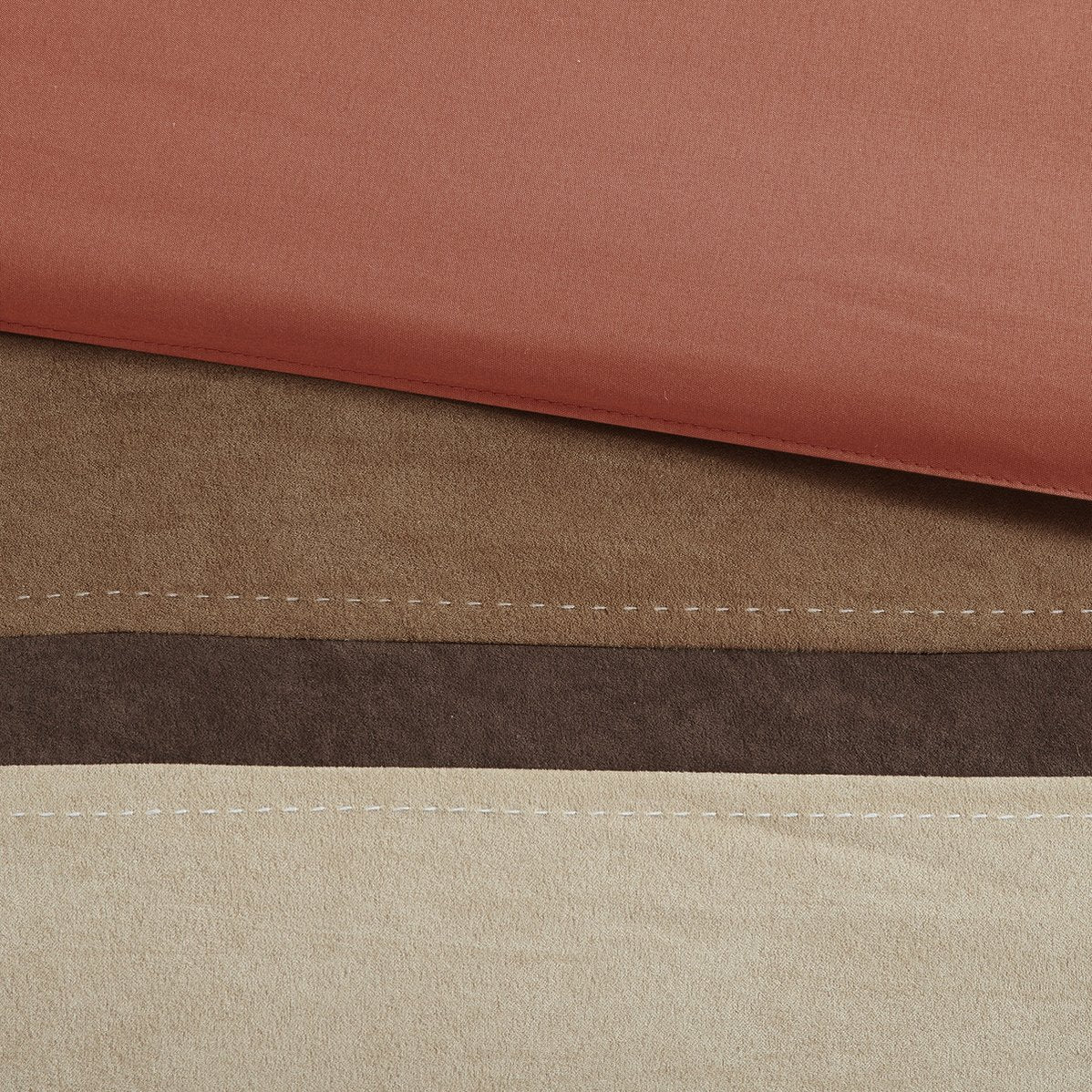 - Design details: Pieced microsuede panels in coral, ivory and brown with embroidered accents on the pillows; solid coral reverse for a clean, coordinated look.