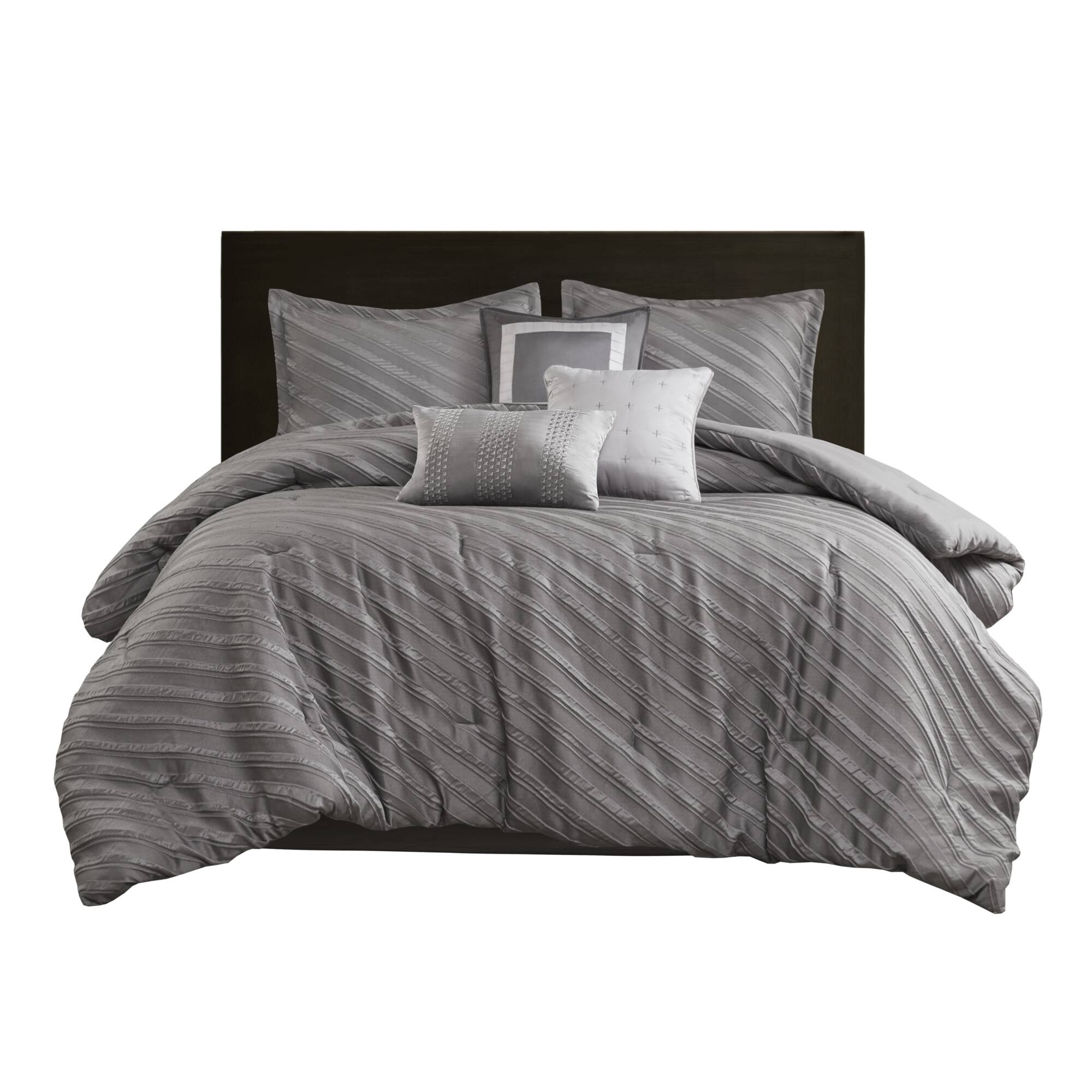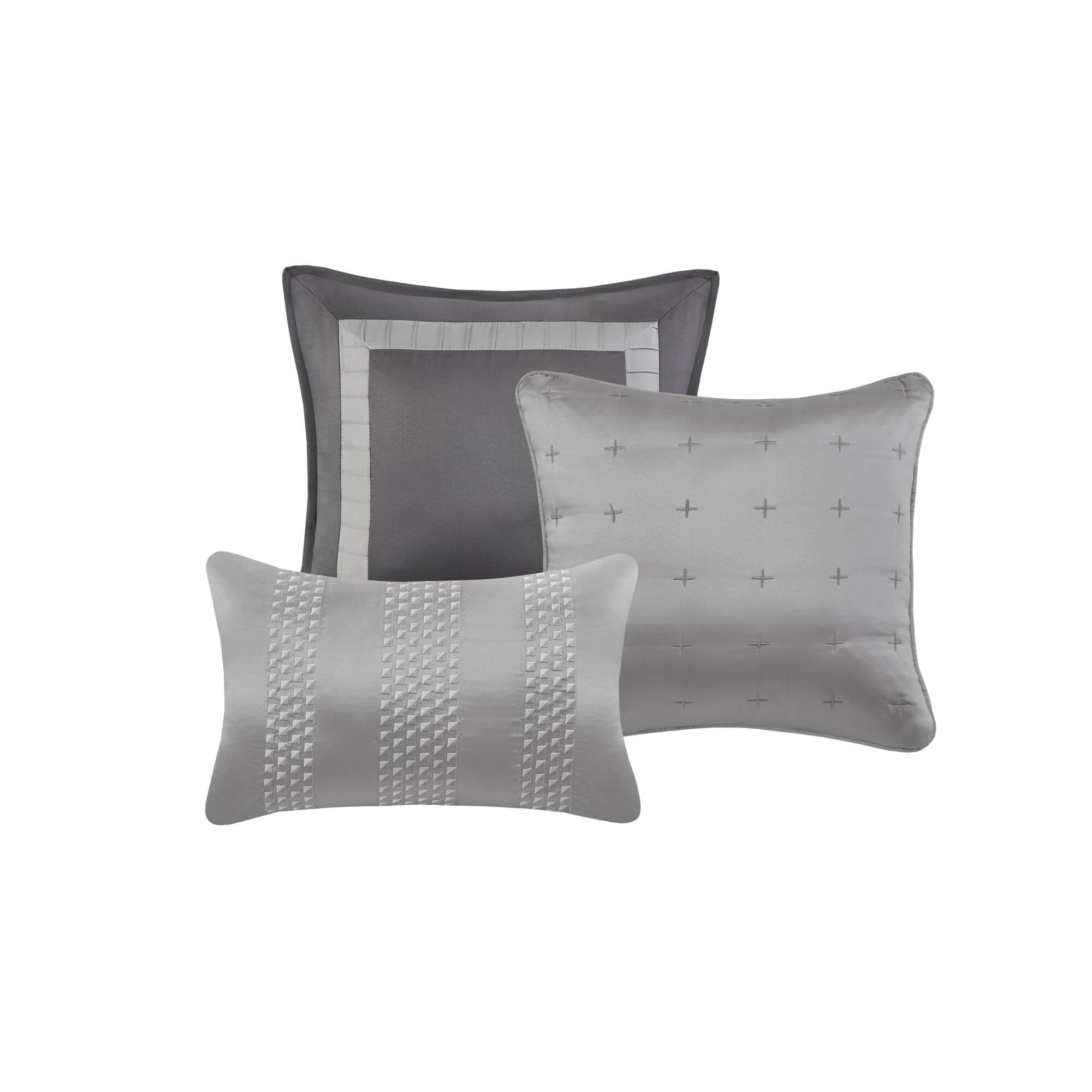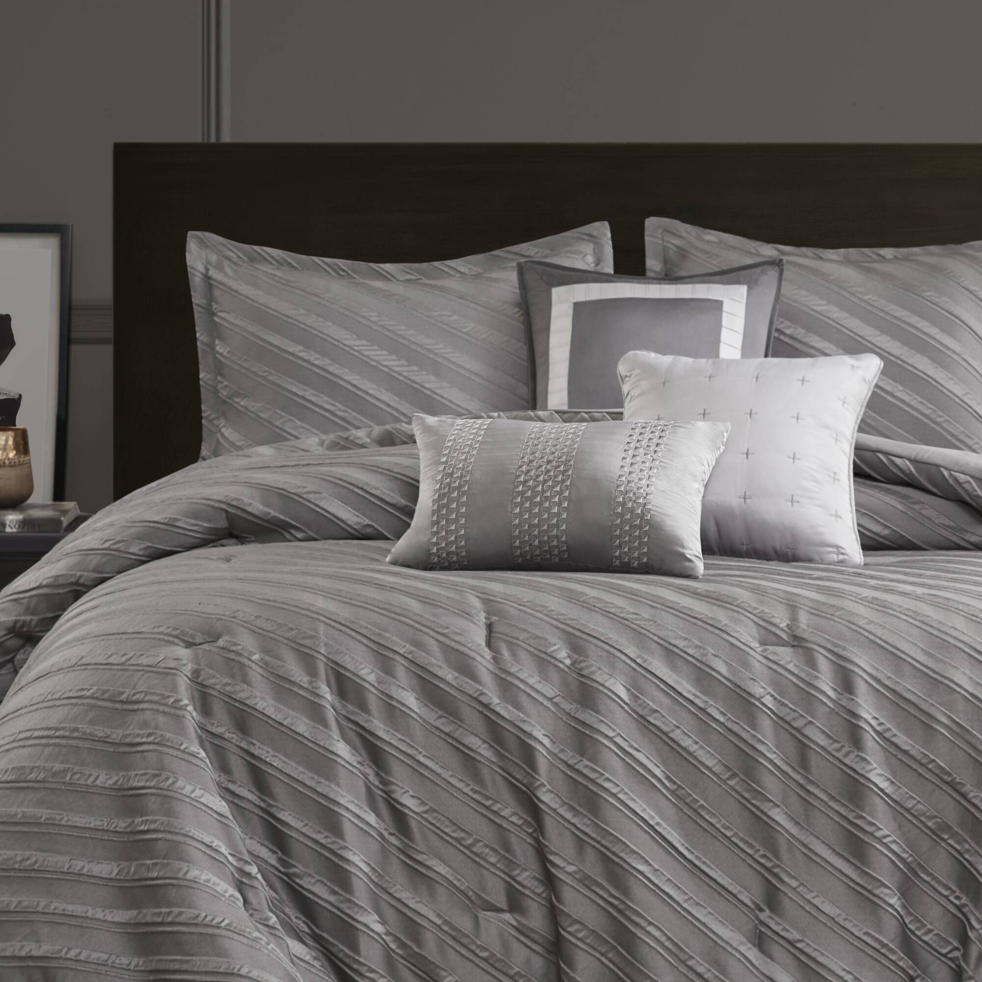 Elevate your bedroom with this elegant 7-piece king comforter set in versatile grey. Thoughtfully designed for comfort and coordinated style, the set pairs a plush, jacquard-faced comforter with matching shams, decorative pillows, and a tailored bedskirt to create a finished, hotel-quality look that's easy to care for and durable for everyday use.
