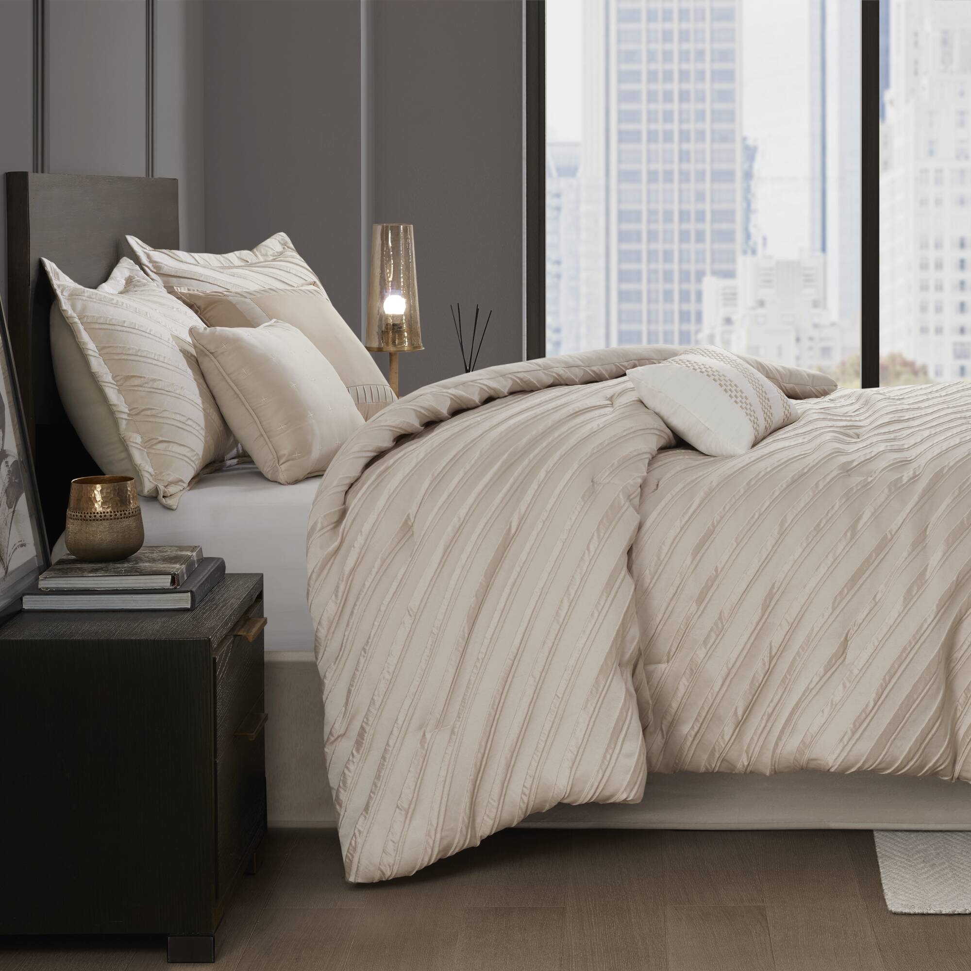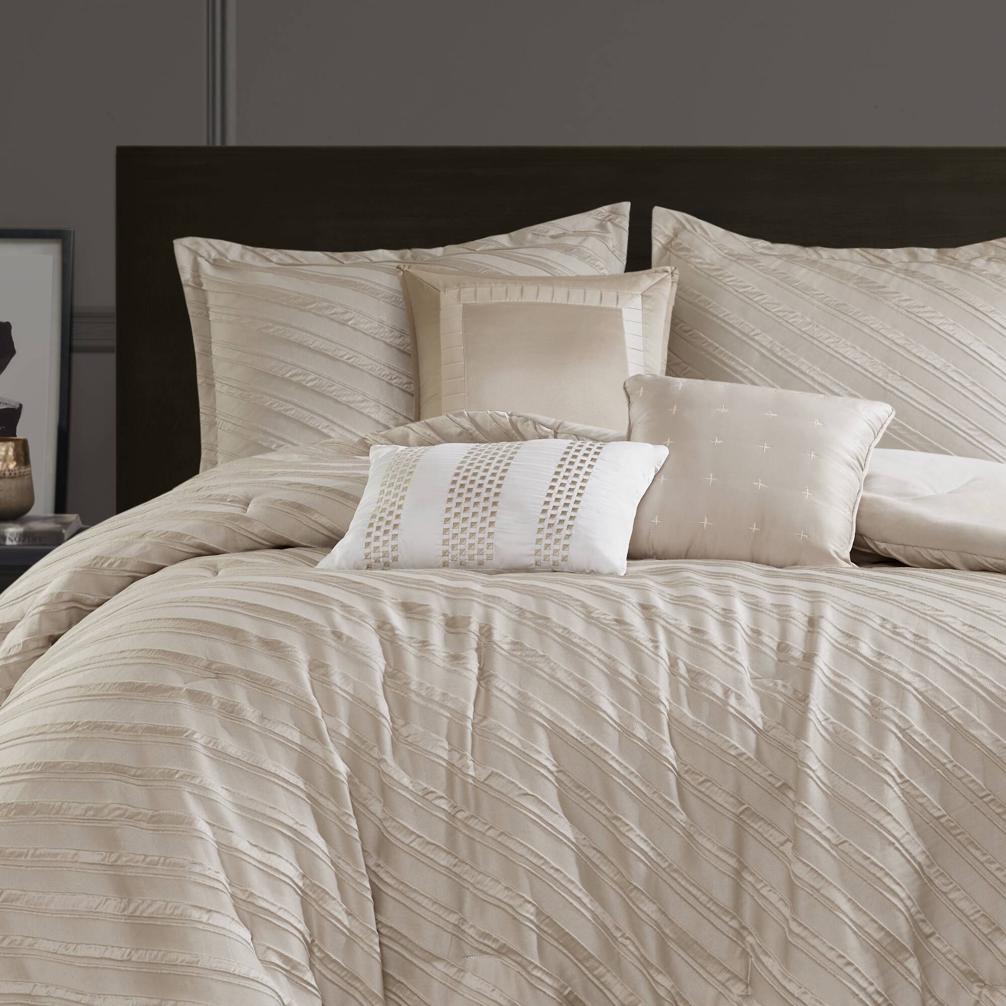 - Materials & construction: Comforter and shams feature a 100% polyester jacquard face with a microfiber back and polyester fill for a soft, insulated feel; bedskirt and pillows are polyester.