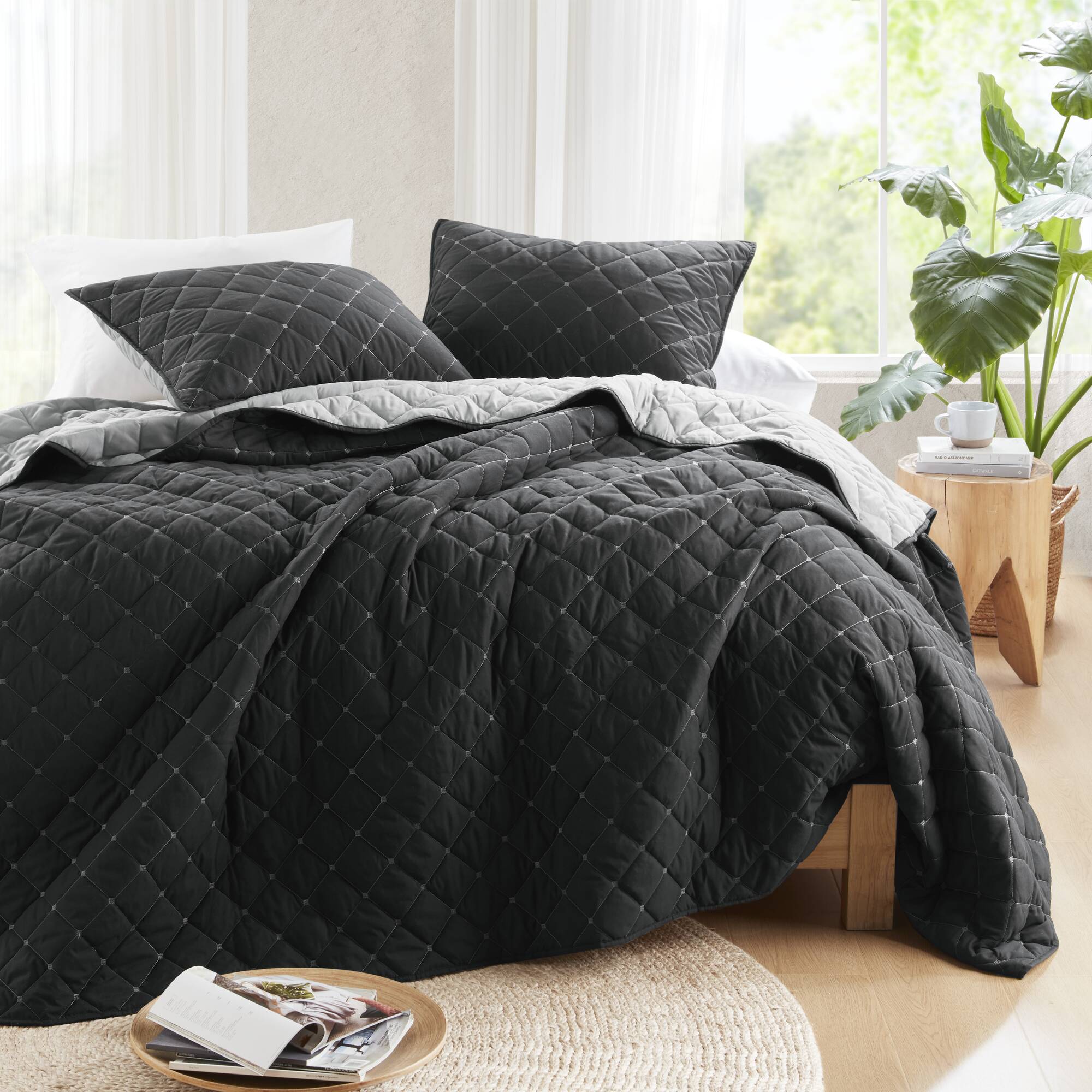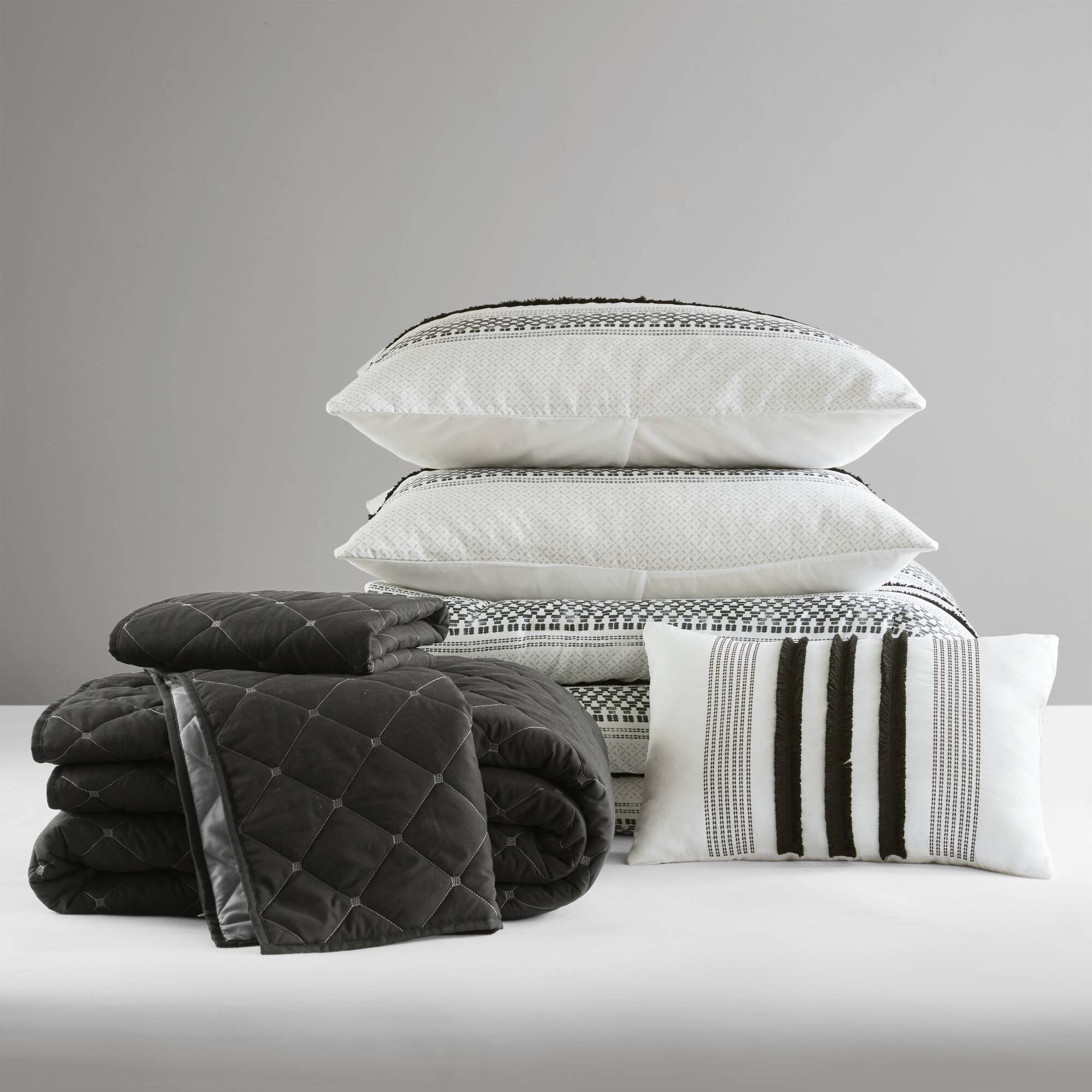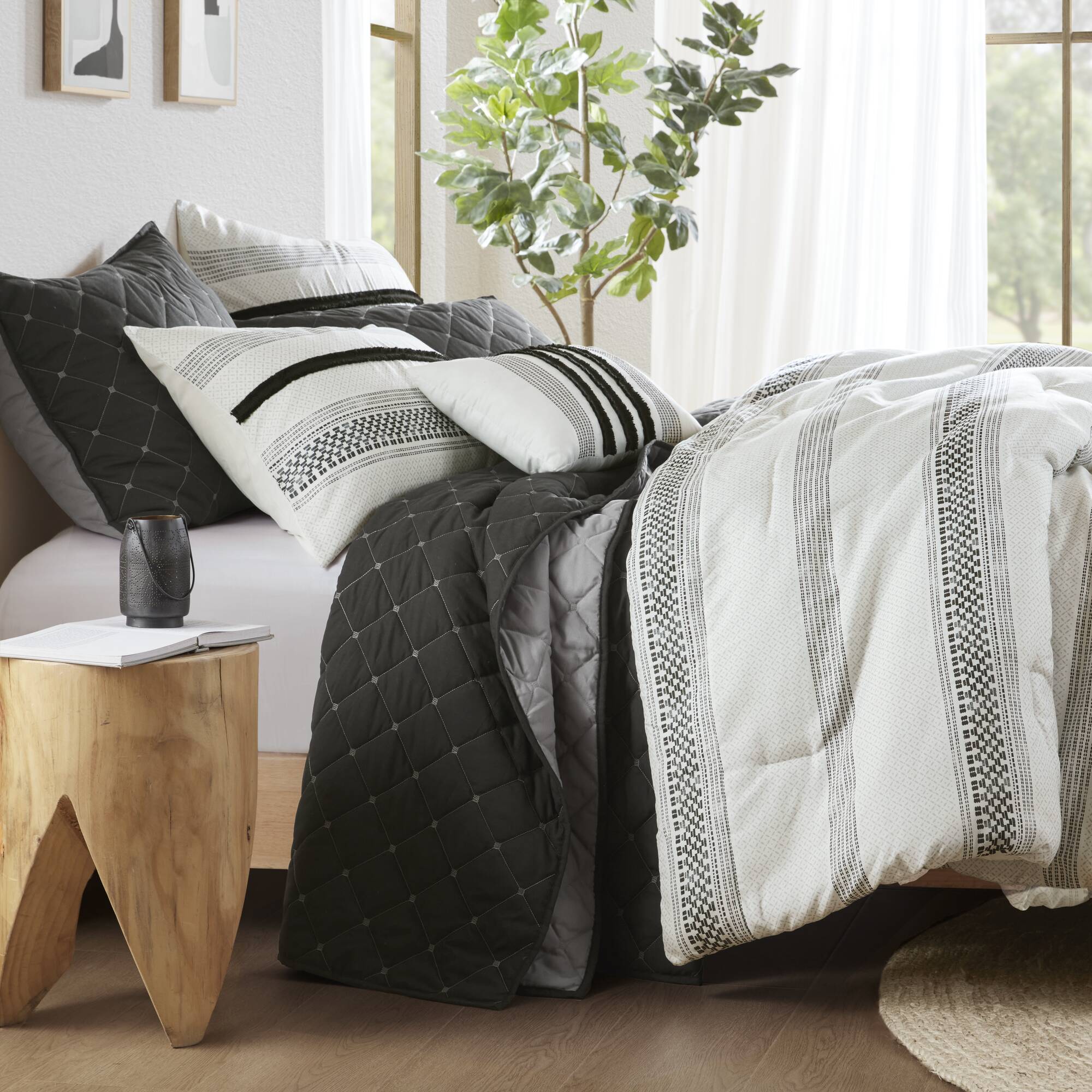 - The madison park carolina 7 piece stripe comforter and quilt set includes everything you need for a stylish and comfortable bed: one comforter, one coverlet, two standard shams, two quilted shams, and one decorative pillow. The black and white comforter set may come wrinkled due to vacuum packed. Please kindly put it in the sun and pat gently for fluffy.