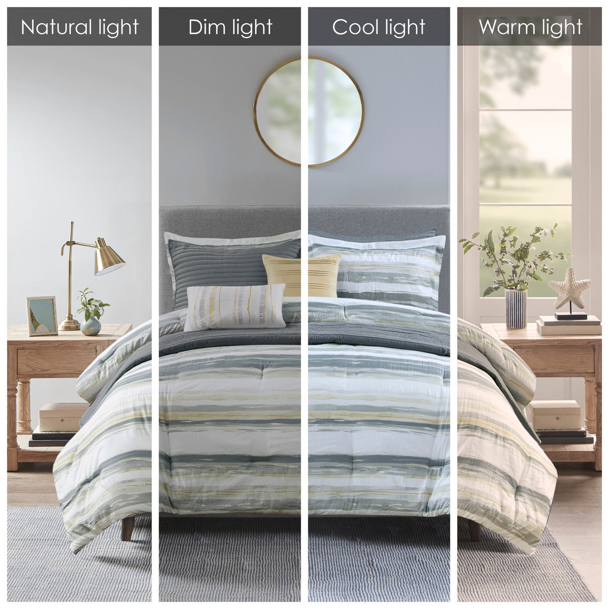 - Design: Textured seersucker comforter with watercolor stripe print in yellow and gray on an off-white reverse; coordinating channel-stitched gray quilt and complementary shams for a cohesive, layered aesthetic.