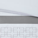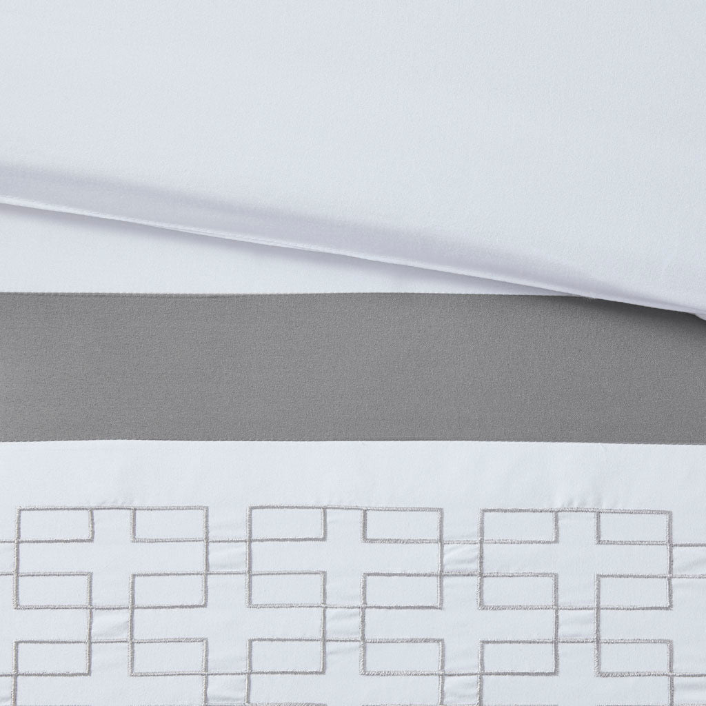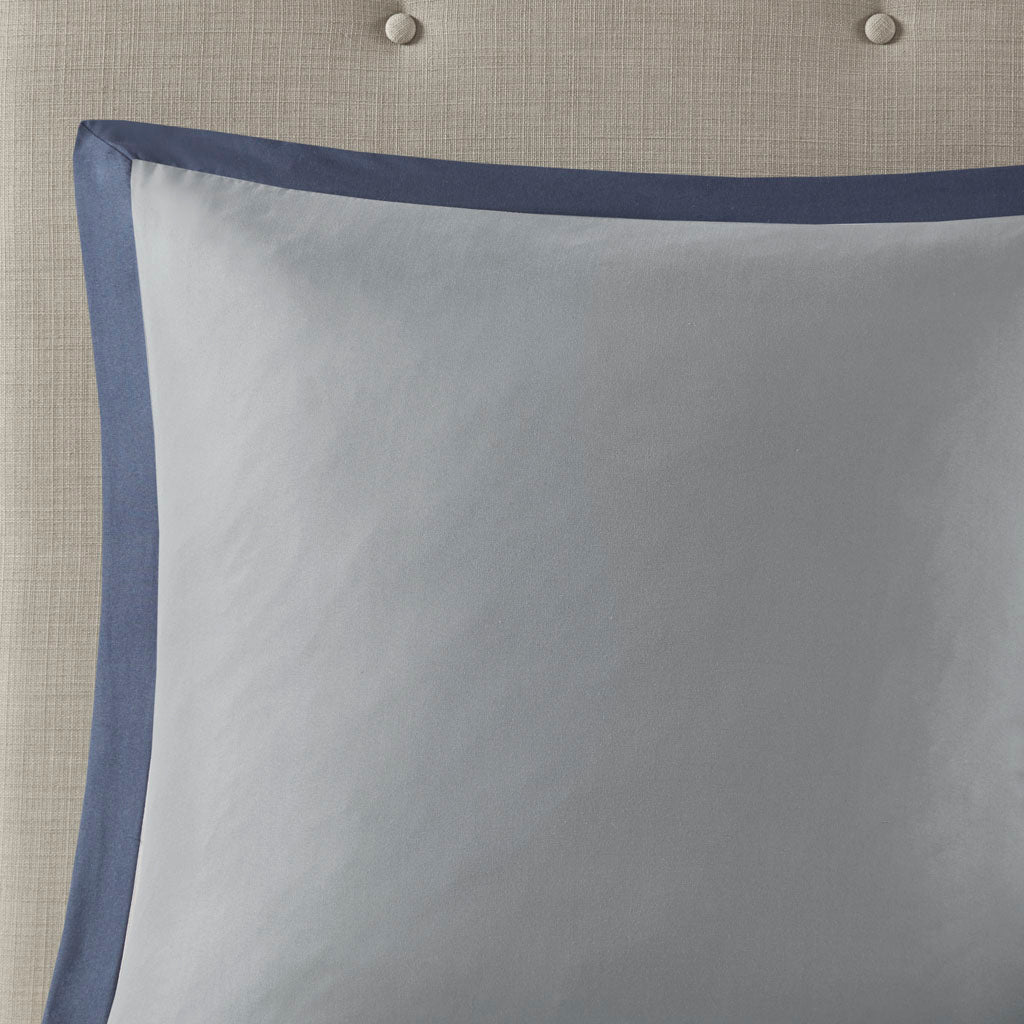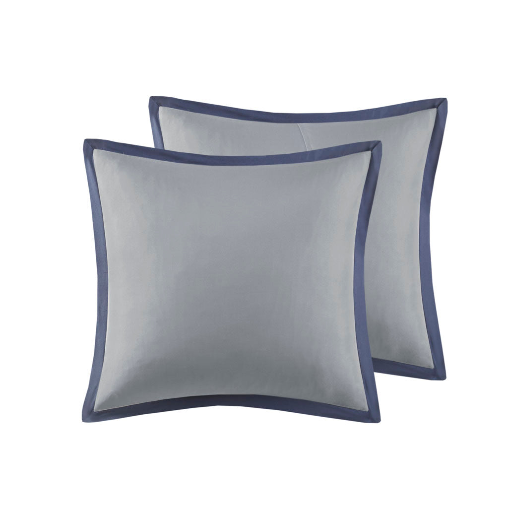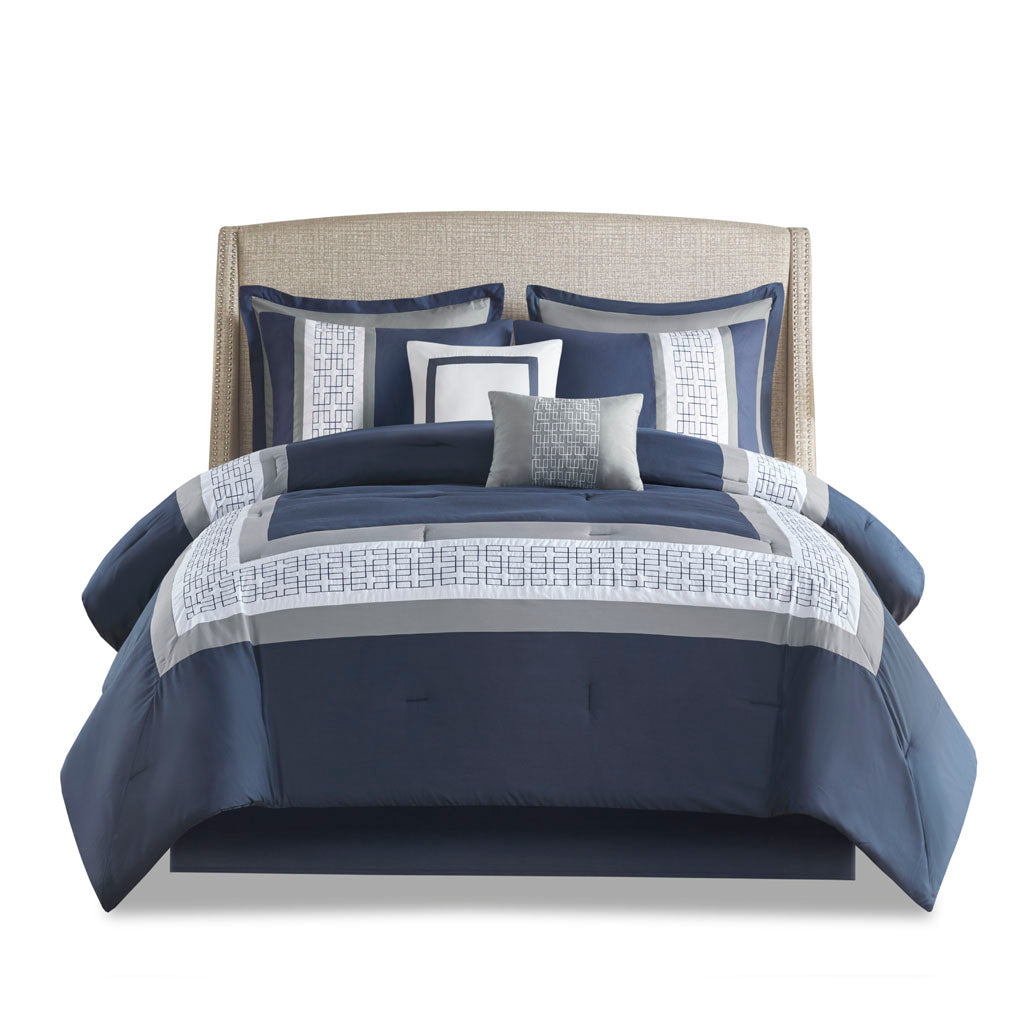 - Transitional, hotel style 8 piece comforter set in navy, grey and white with embroidered and pieced details