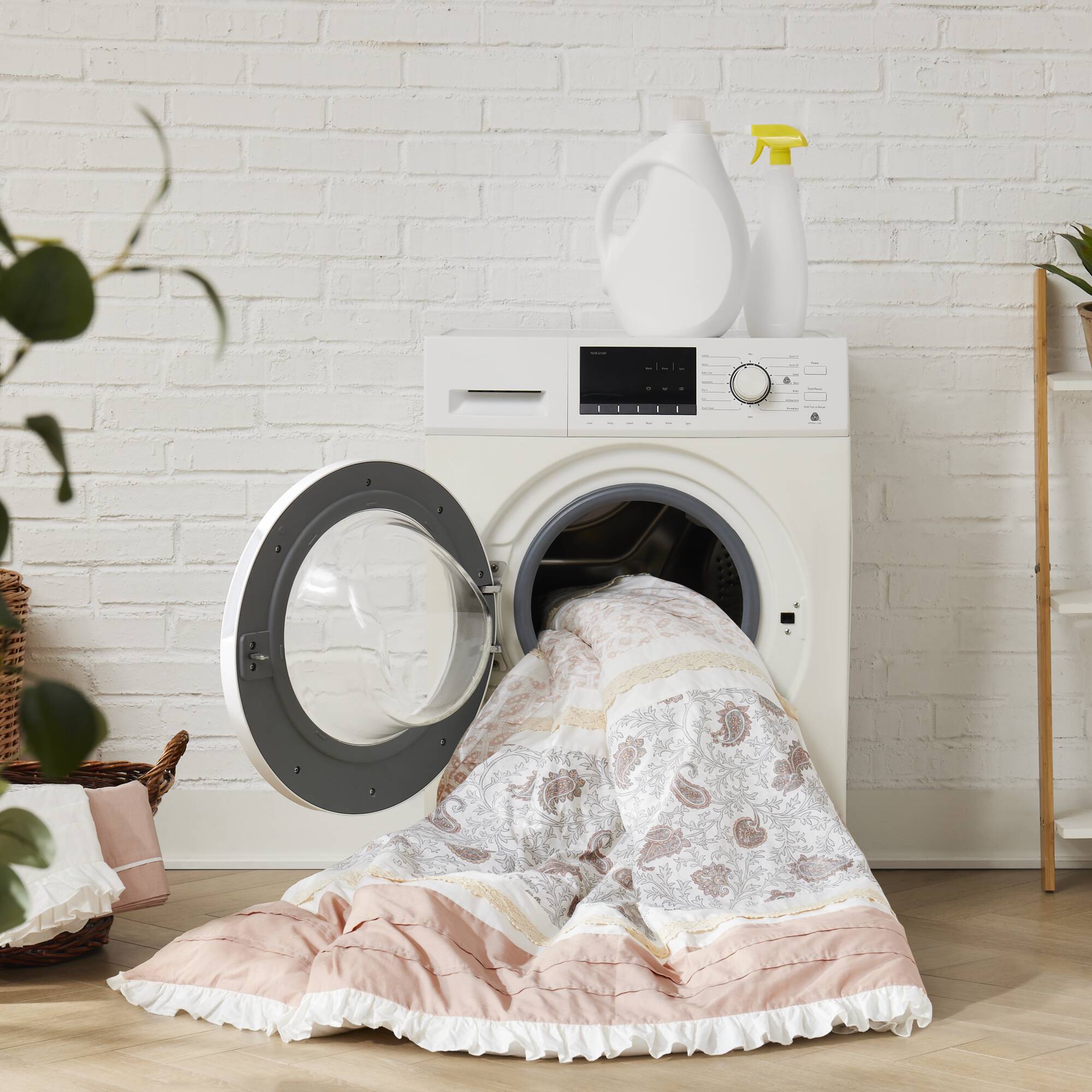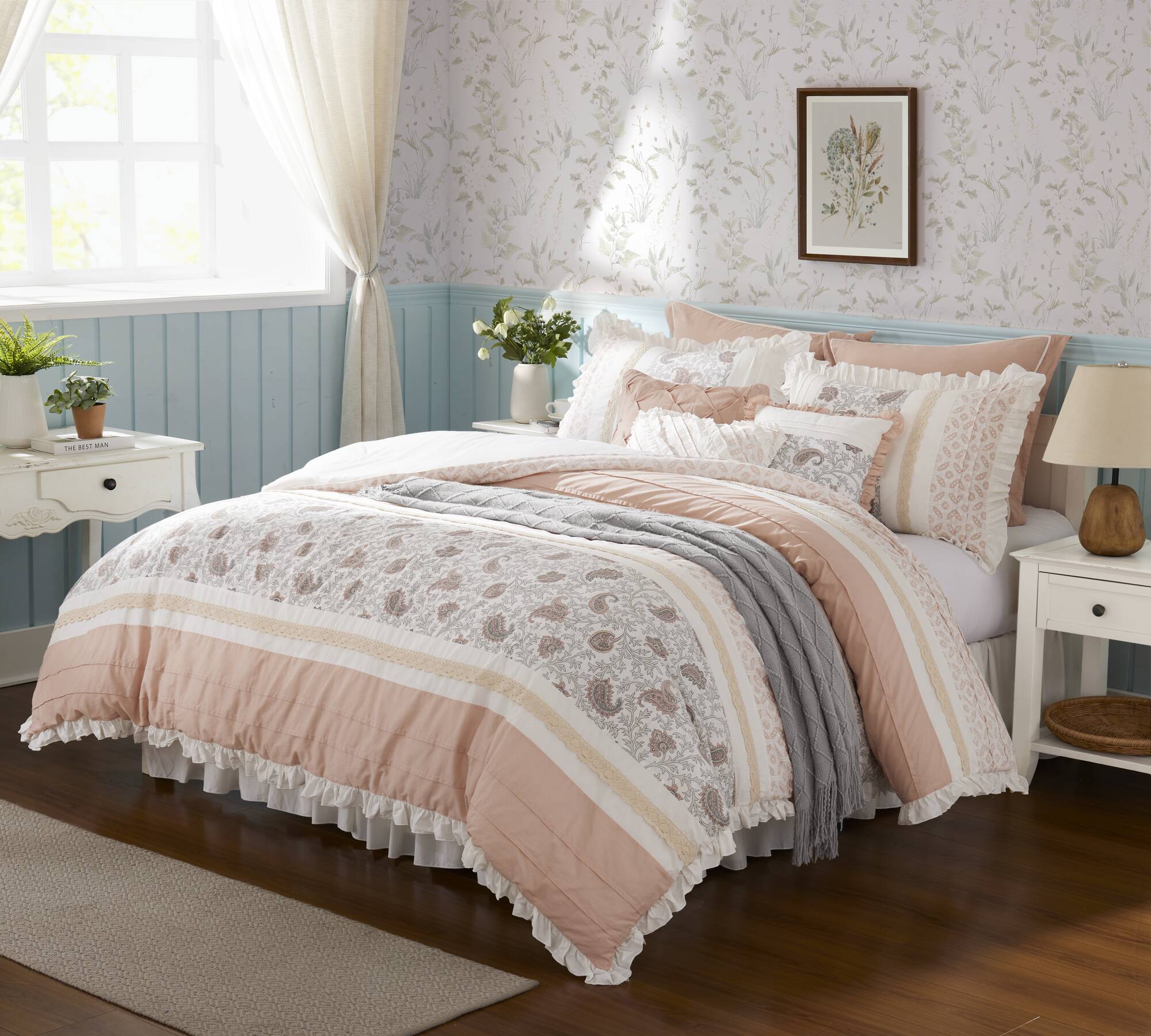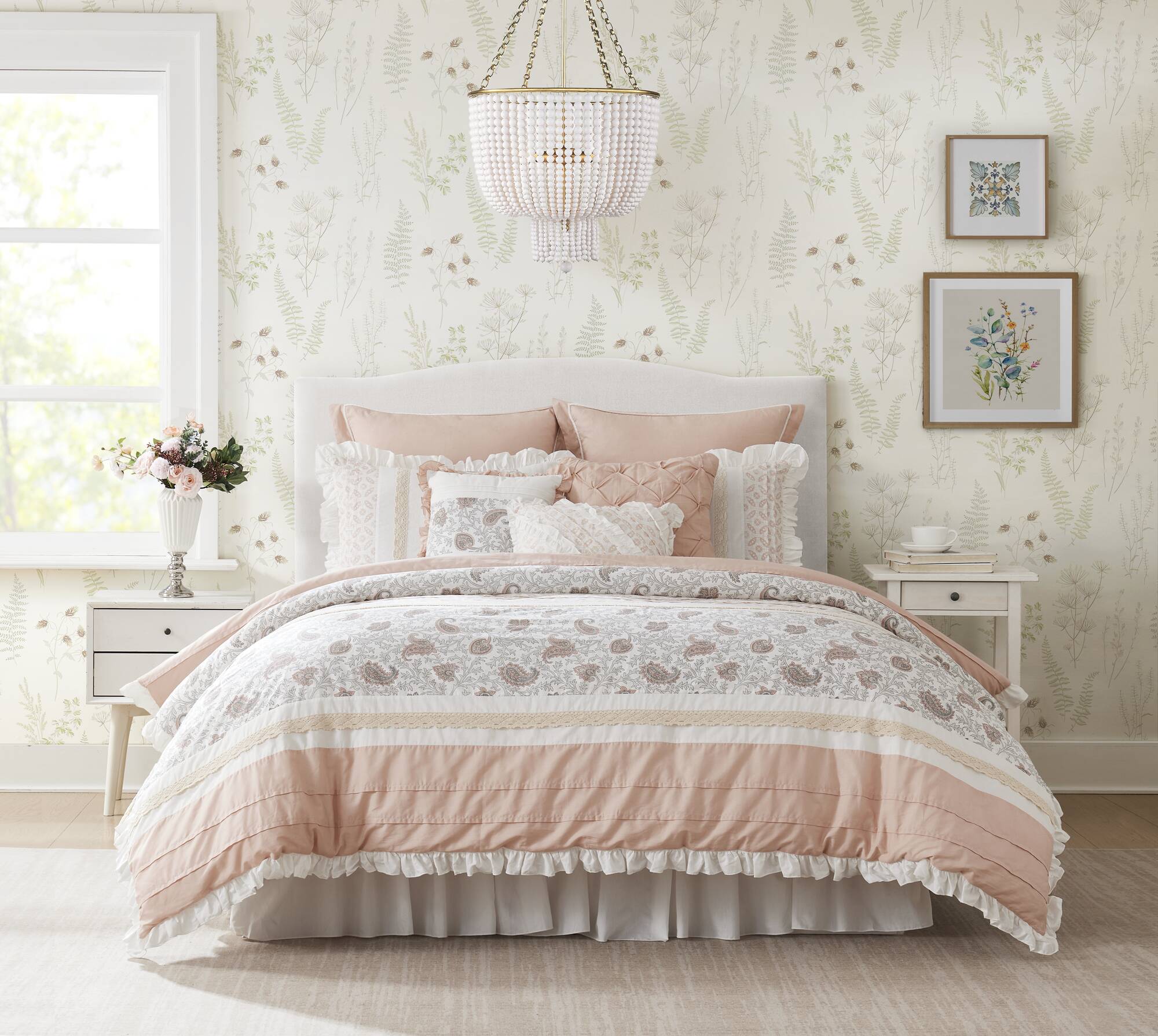 Refresh your bedroom with the Madison Park Dawn 9-piece Cotton Percale Comforter Set in Blush—a cottage-chic collection that blends timeless paisley print, delicate pintucking, and lace taping for a soft, romantic look. Thoughtfully designed details like a ruched flange, coordinated Euro shams, decorative pillows, and a tailored bedskirt create a layered, hotel-worthy presentation while OEKO-TEX certification ensures the fabrics are free from harmful substances for safer, healthier sleep.