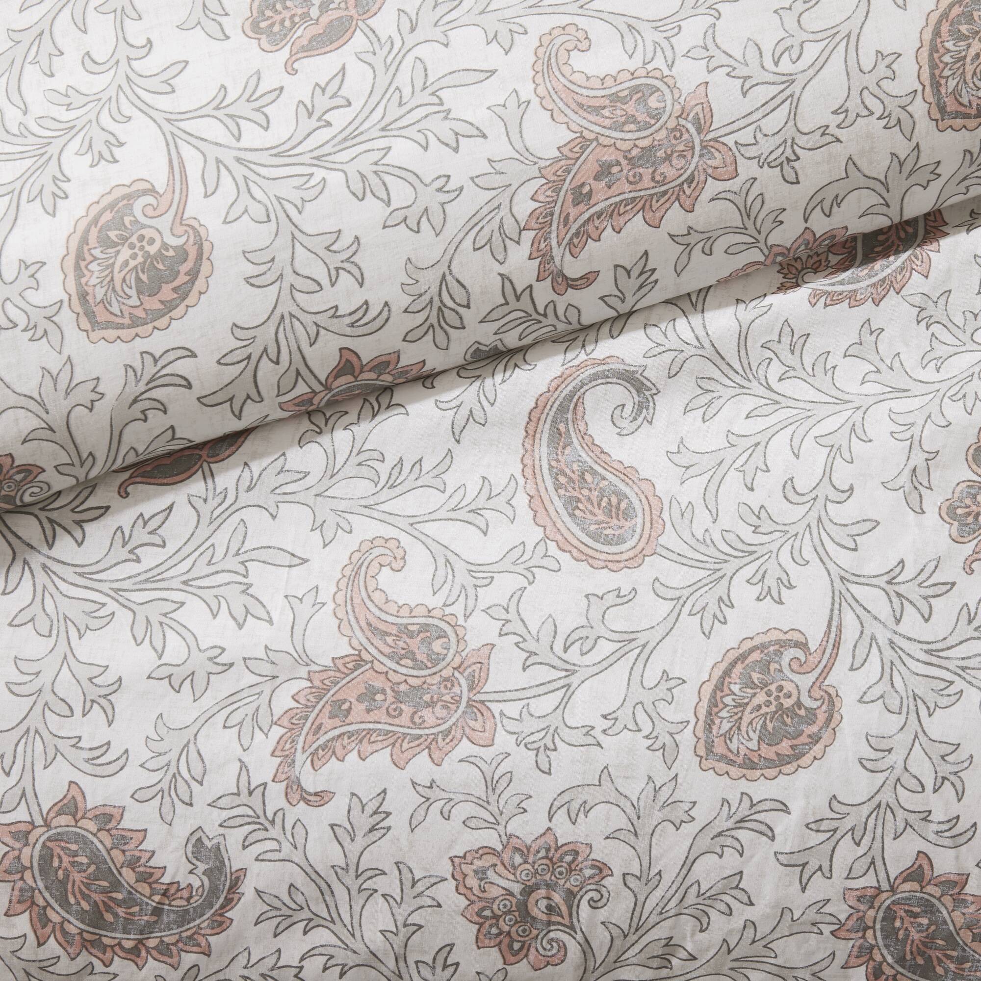 - Fabric & fill: Cotton percale comforter face with printed paisley, pintuck detailing, lace taping, and ruched flange; cotton/polyester reverse and polyester fill for loft and durability.