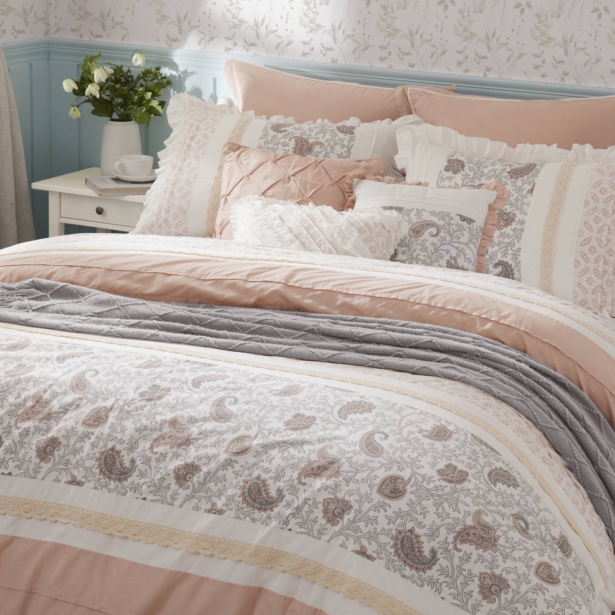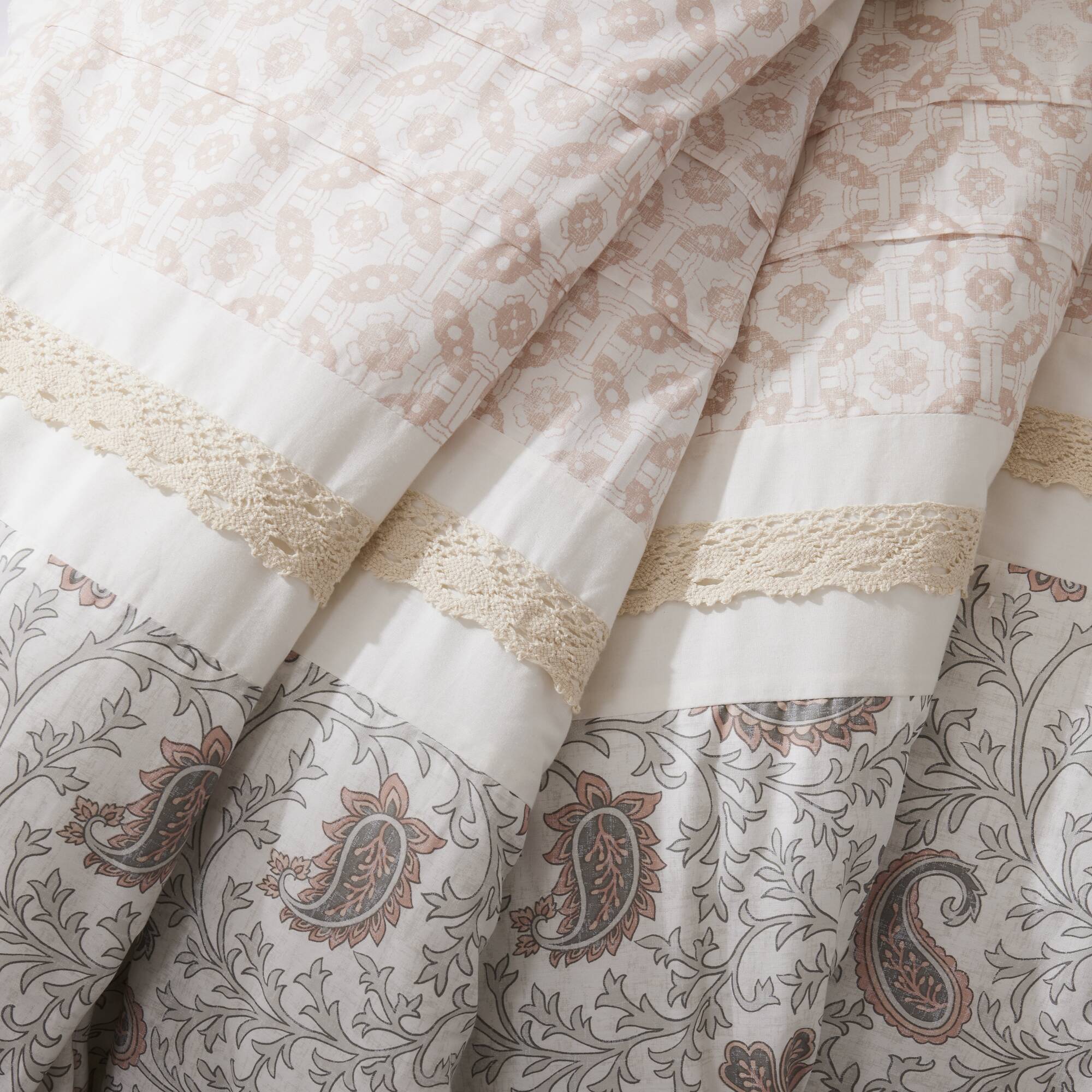 - Material & construction: Cotton percale face with printed paisley, pintuck paneling, lace taping, ruched flange details; polyester-filled comforter and pillow inserts for loft and durability.