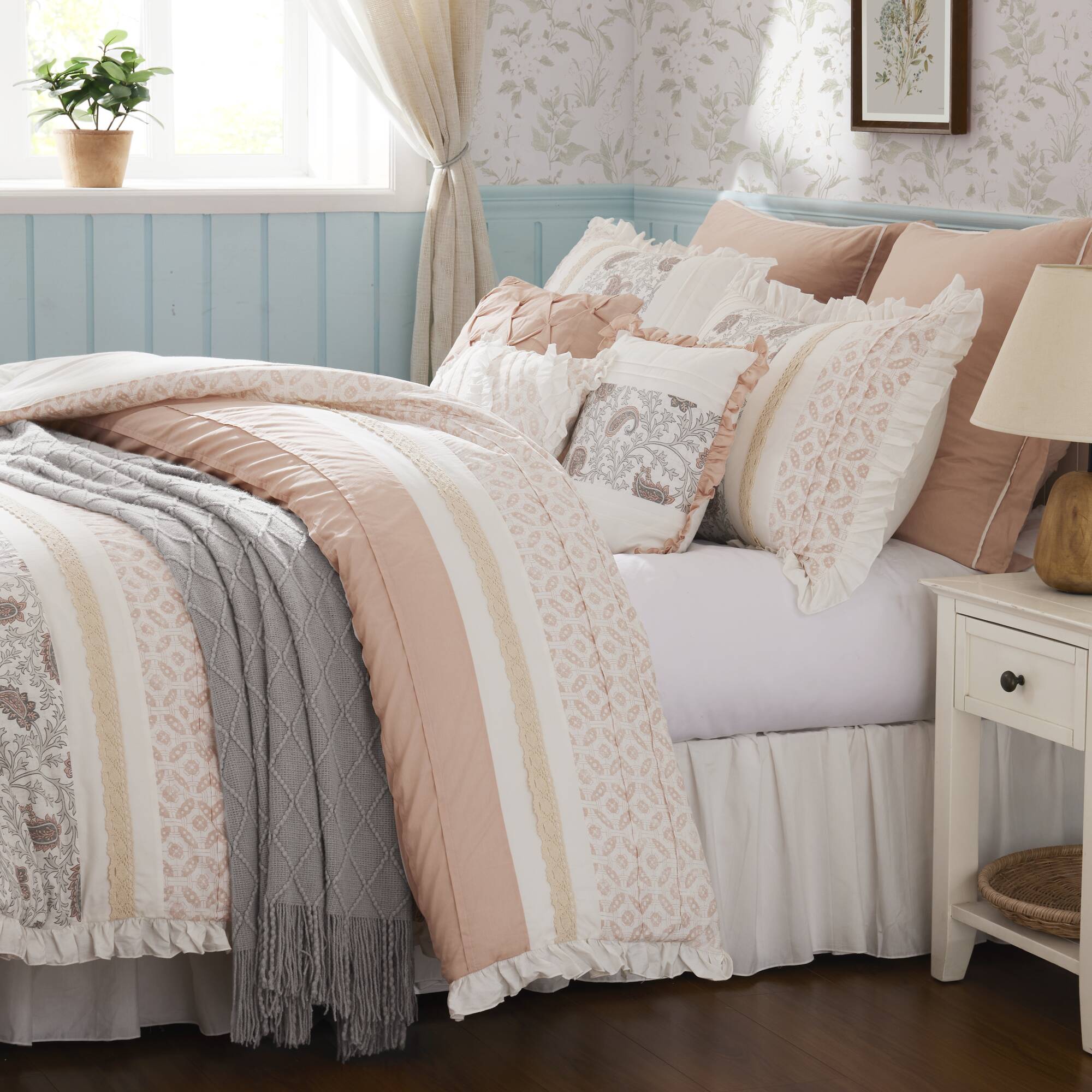 Refresh your bedroom with the timeless, cottage-inspired charm of this 9-piece cotton percale comforter ensemble. Designed for comfort and visual appeal, the set pairs a delicate paisley print and pintucked detailing with lace taping and ruched flange accents for an elegant shabby-chic look. OEKO-TEX® certification ensures the fabrics are free from harmful substances, giving you peace of mind along with style. Ideal for layering, the coordinated pieces create a finished, luxurious bed presentation that’s ready to personalize with additional pillows or a matching shower curtain (sold separately).