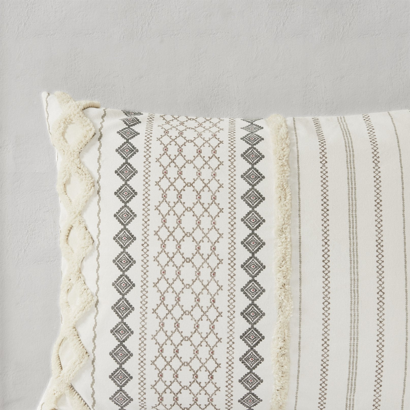 - Finish & Design: Geometric print with tufted chenille details and visible bartacks for a tailored, duvet-like look; solid reverse for versatile styling