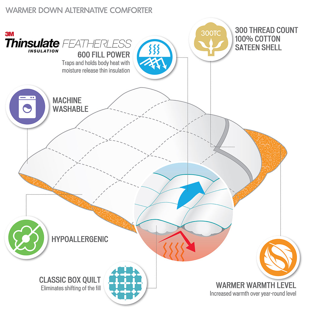 Experience the cloud-like comfort of this Full/Queen down alternative comforter, engineered to deliver warmth, loft, and hypoallergenic ease without using natural feathers. Crafted with advanced 3M™ Thinsulate™ Featherless Insulation and a silky 300-thread-count cotton sateen shell, this comforter offers breathable softness, stable lofting through box quilting, and easy care for everyday use.