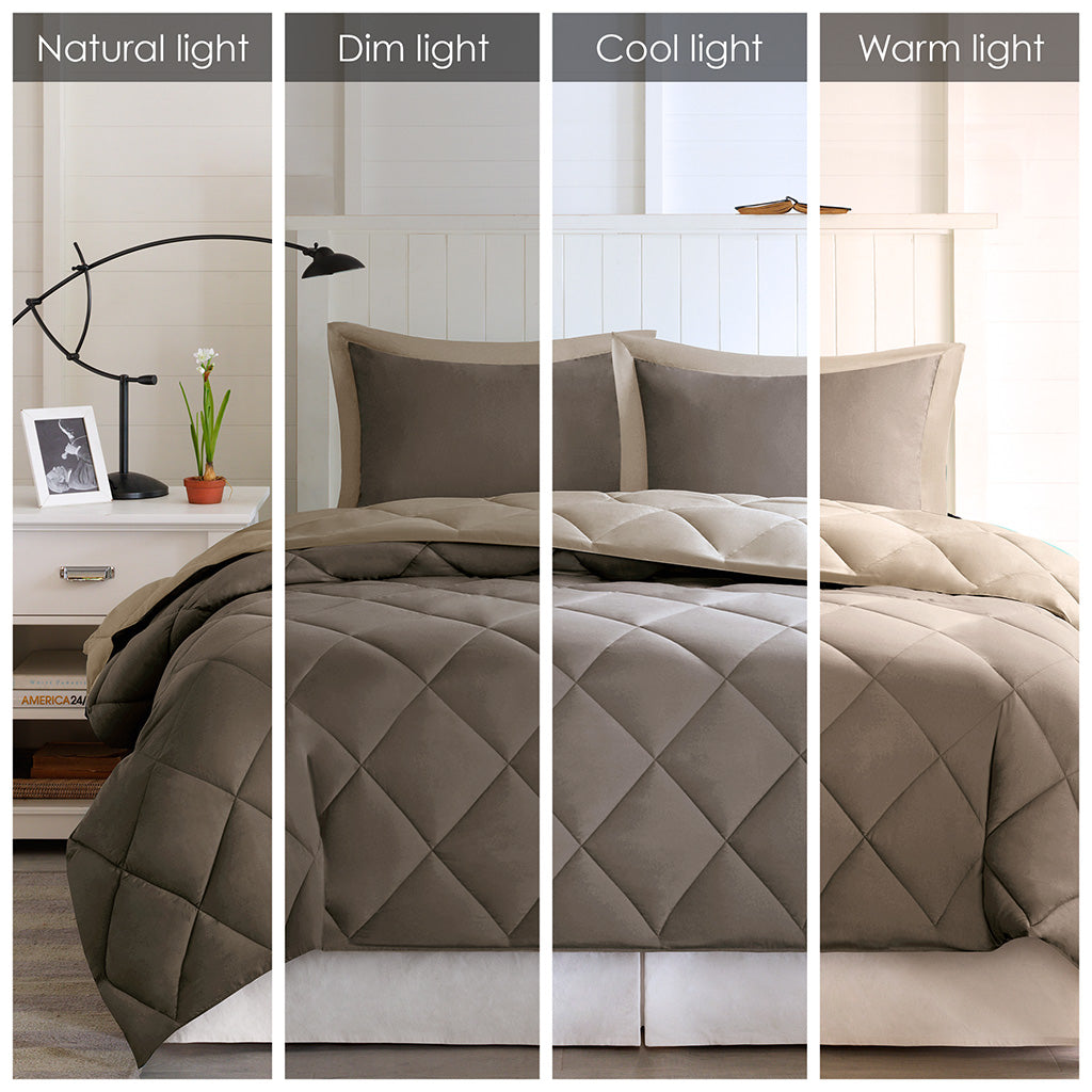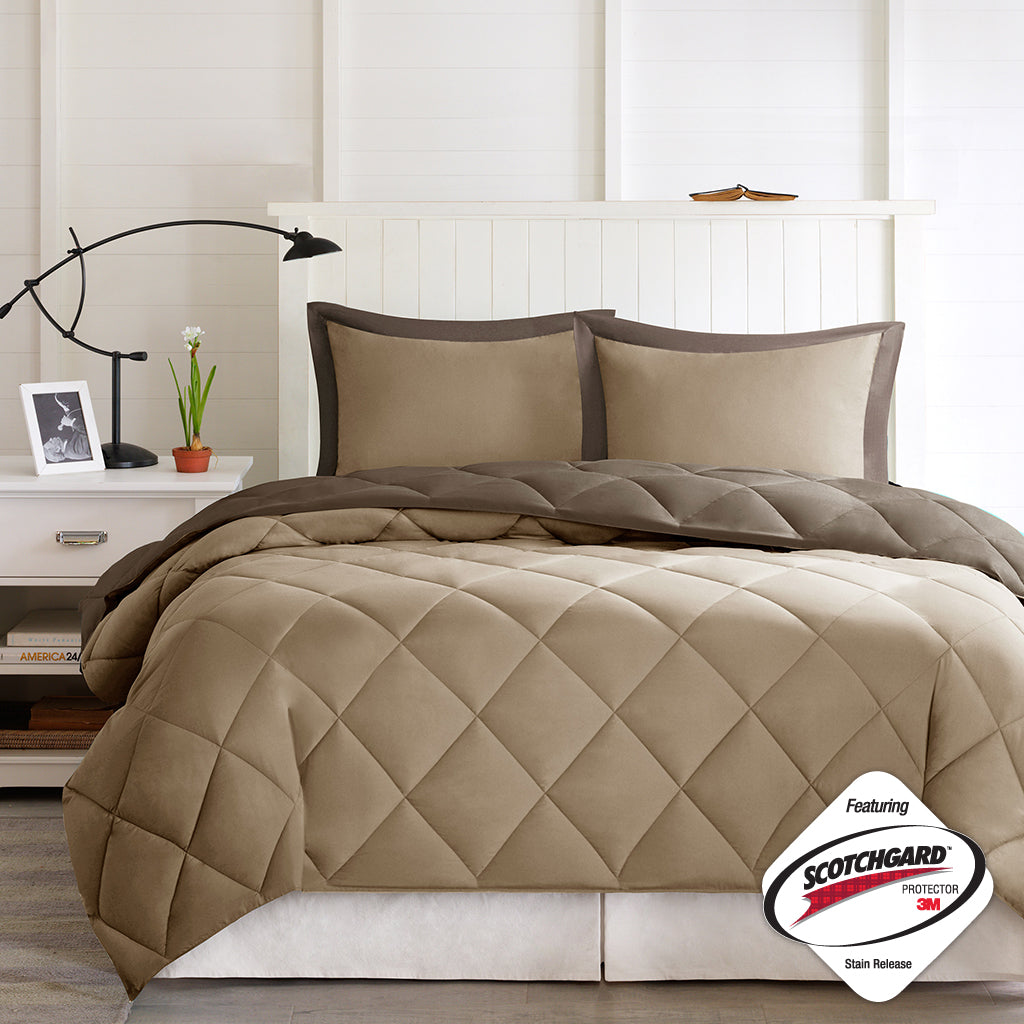 Wrap your bed in cloud-like comfort and practical protection with this reversible down alternative comforter set. Crafted from ultra-soft 100% polyester microfiber with 3M Scotchgard stain resistance and an odor-neutralizing antimicrobial treatment, it delivers lasting softness, easy care, and reliable warmth. The sewn-through diamond quilting keeps the fill evenly distributed while the reversible design and matching shams offer versatile styling without the need for a duvet cover.