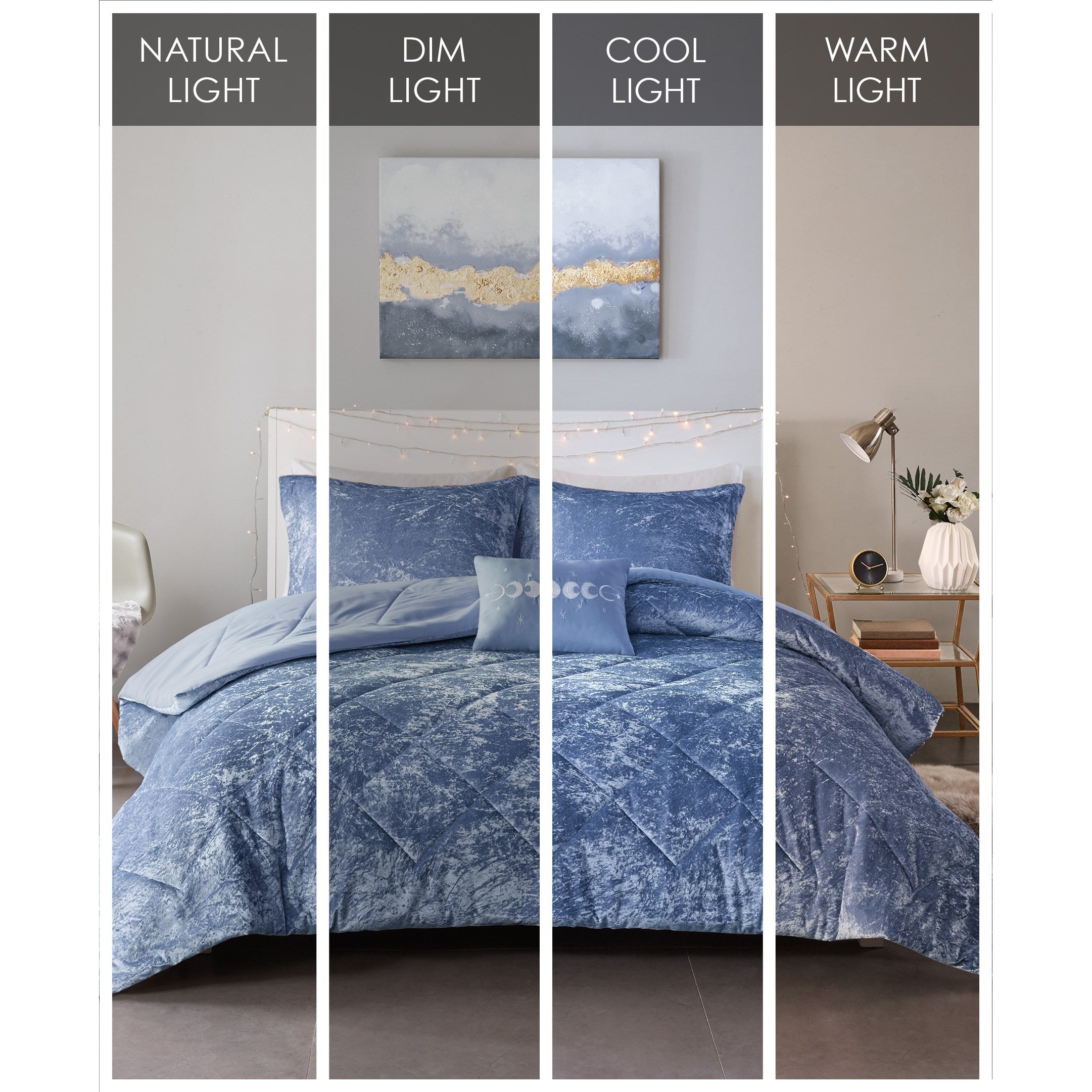 - Luxurious, periwinkle blue crushed velvet comforter set features diamond quilting on top of the bed